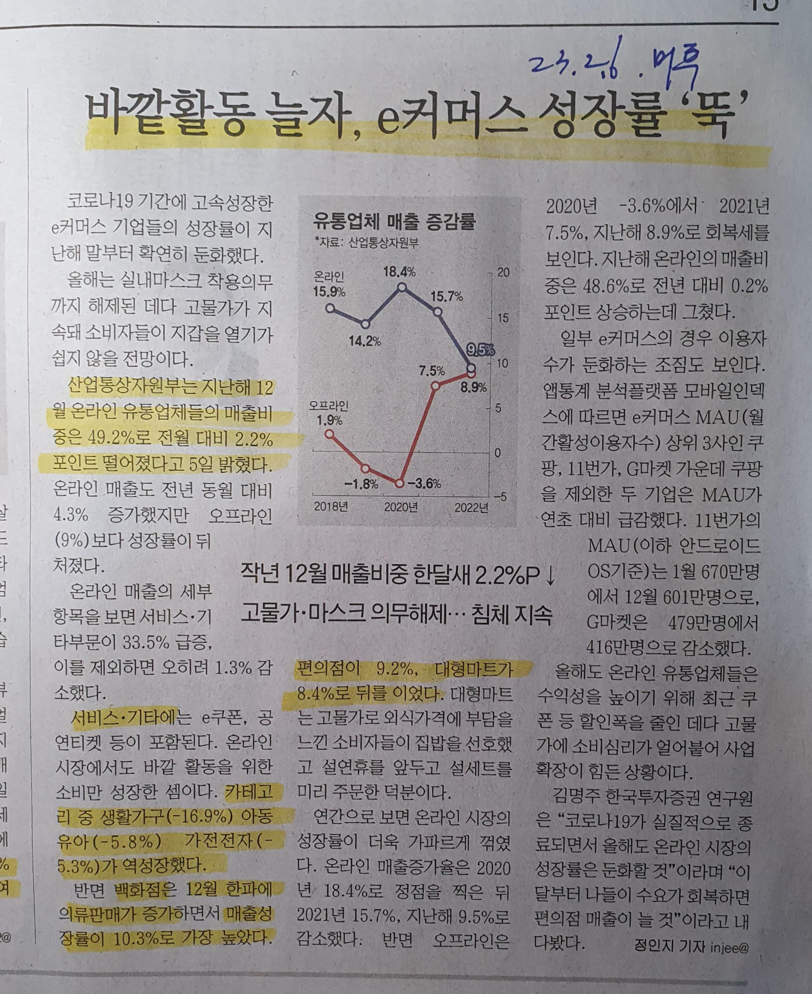 위드코로나 마무리 시기, 온/오프라인 유통업체 매출 증감률 23.2.6 머투