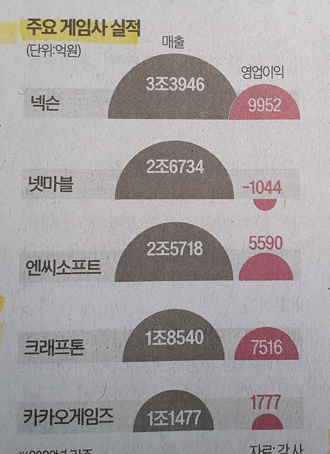 -3N 이라 불리는 게임사의 실적 넥슨 선방, 엔씨 보통, 넷마블 하락, 가장 큰 차이점은 넥슨은 기존의 아이피를 활용하여 모바일 게임화한 던전 앤 파이터즈와 캐시카우 양산형 MMO RPG 지만 꾸준한 히트2가 견인, 엔씨는 기존의 리지니 아이피로 여전히 유지 중이며 유일하게 넷마블의 경우만 신장 게임의 반응이 좋지 않아 10년 만의 적자상태로 영업이익을 마무리하였다.( -1044억원)