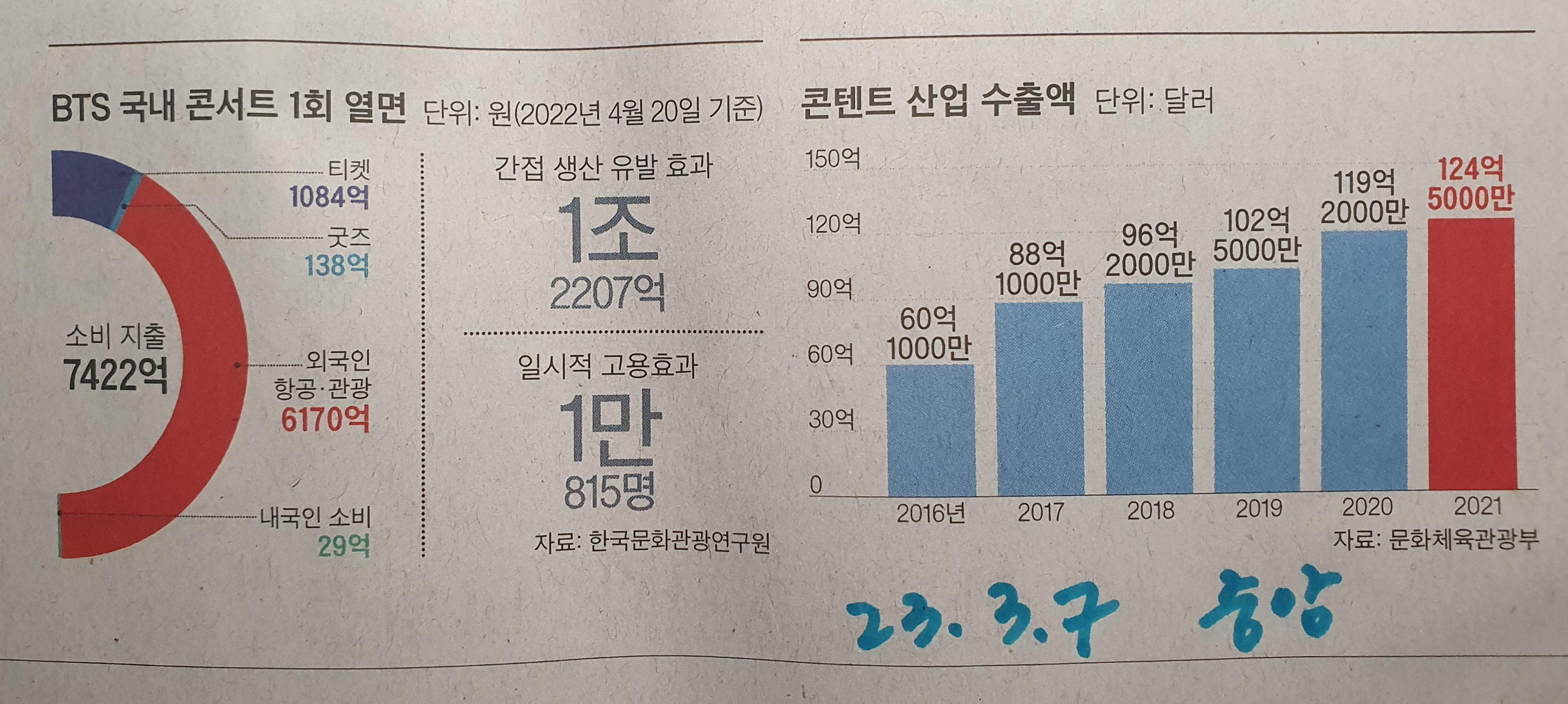 K 콘텐트 산업 수출 및 BTS 콘서트 효과 1조! 23.3.7 중앙