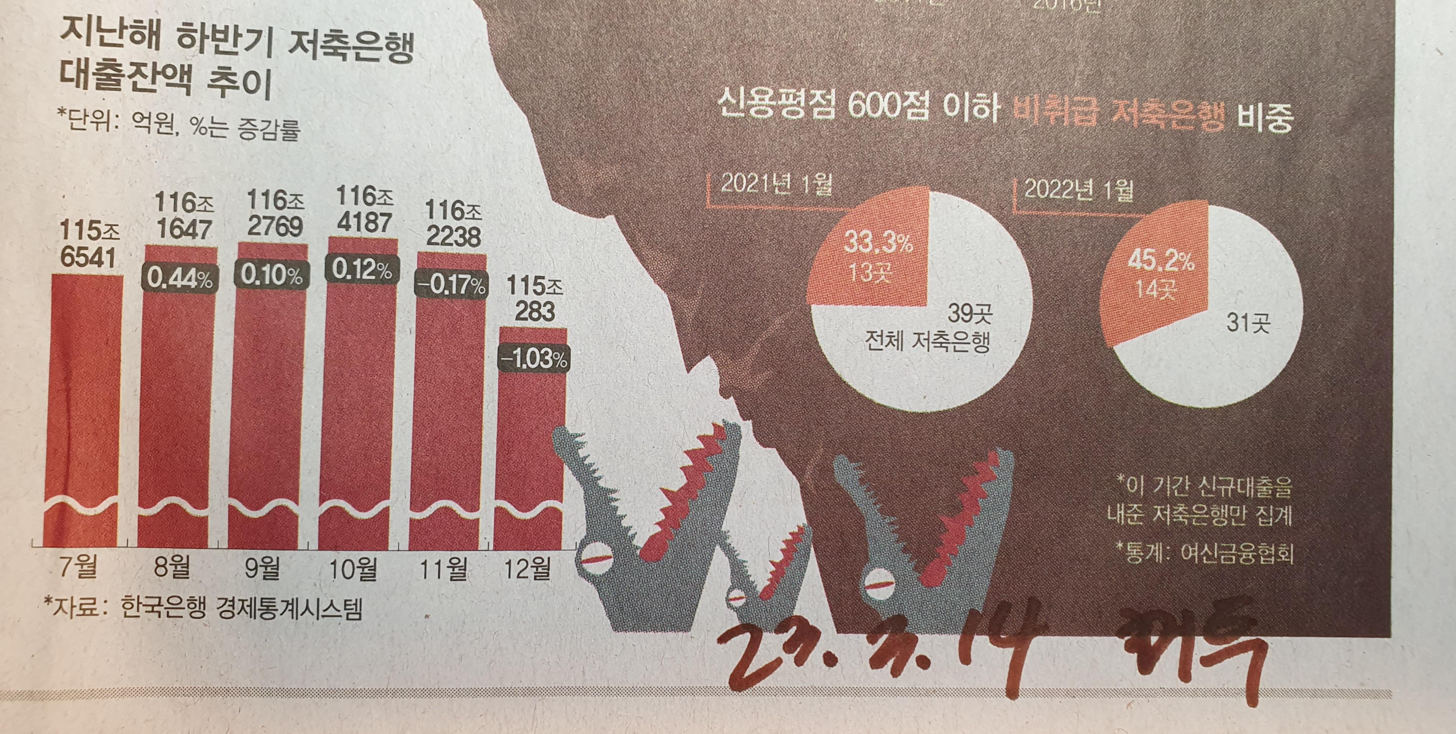 -대출잔액의 1조원 가량 감소, 신용평점이 낮은 600점 이하 비취급 상태의 증가 상태.
