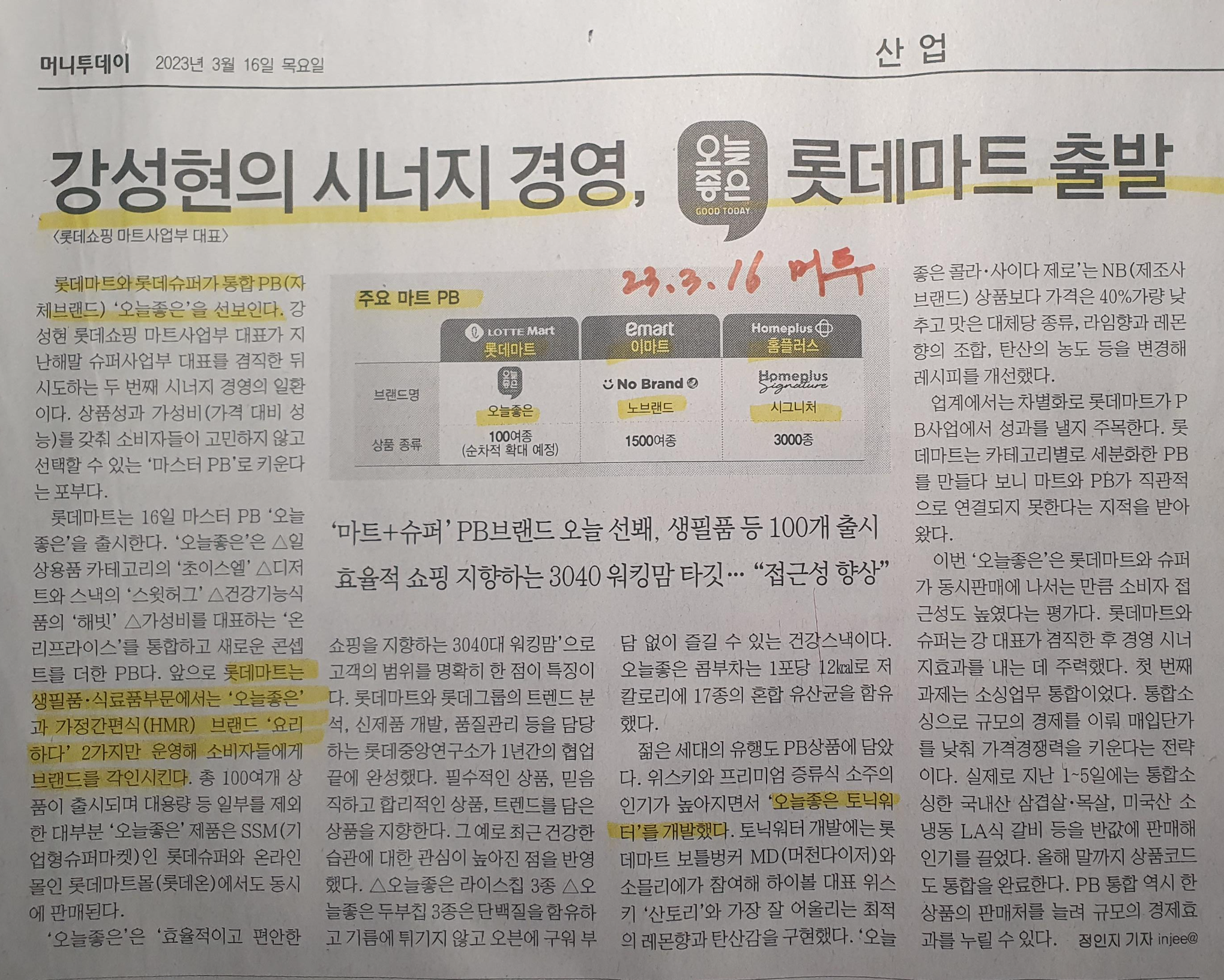 Comment)) 집근처 롯데마트를 자주가는 편이라 관련 기사 스트랩. 과거에는 PB 제품이 저가에 품질도 저가라는 인식이 있었지만 최근에는 대형유통사의 충성 고객을 이끌어 낼 수 있는 좋은 홍보 제품으로 신경을 많이 쓰고 있다. 롯데마트의 경우에는 셀렉트와 초이스엘과 스윗허그등의 PB 제품 브랜드가 분산되어 있었지만 브랜드 이미지 통합으로 이제는 '오늘좋은' 으로 판매 예정이다.