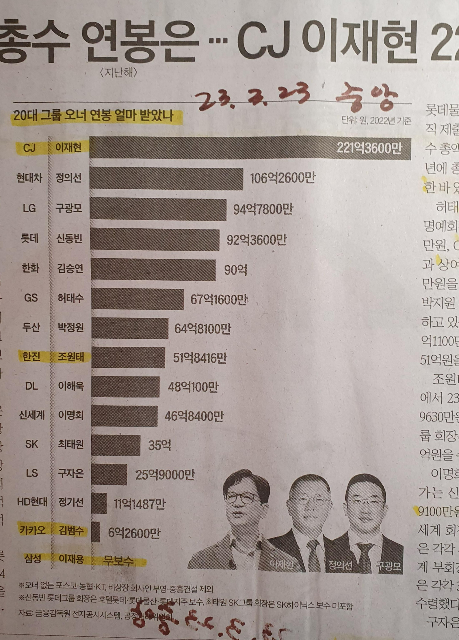 2022년 재벌 총수 연봉은 얼마일까? 200억대 연봉받는 1위는? 23.3.23 중앙