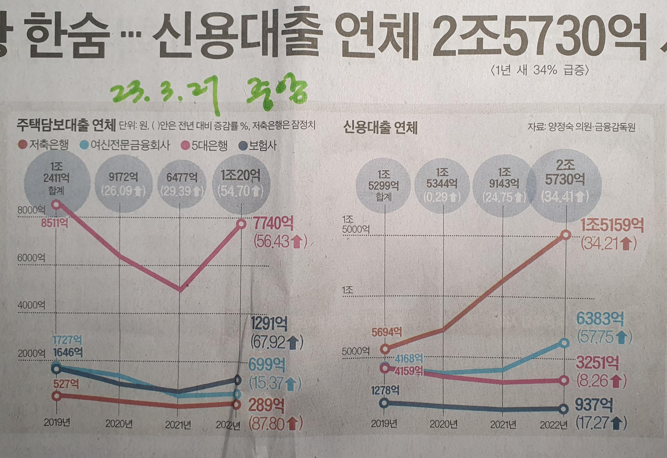 주택담보대출, 신용대출 연체율 급상승 23.3.27 중앙