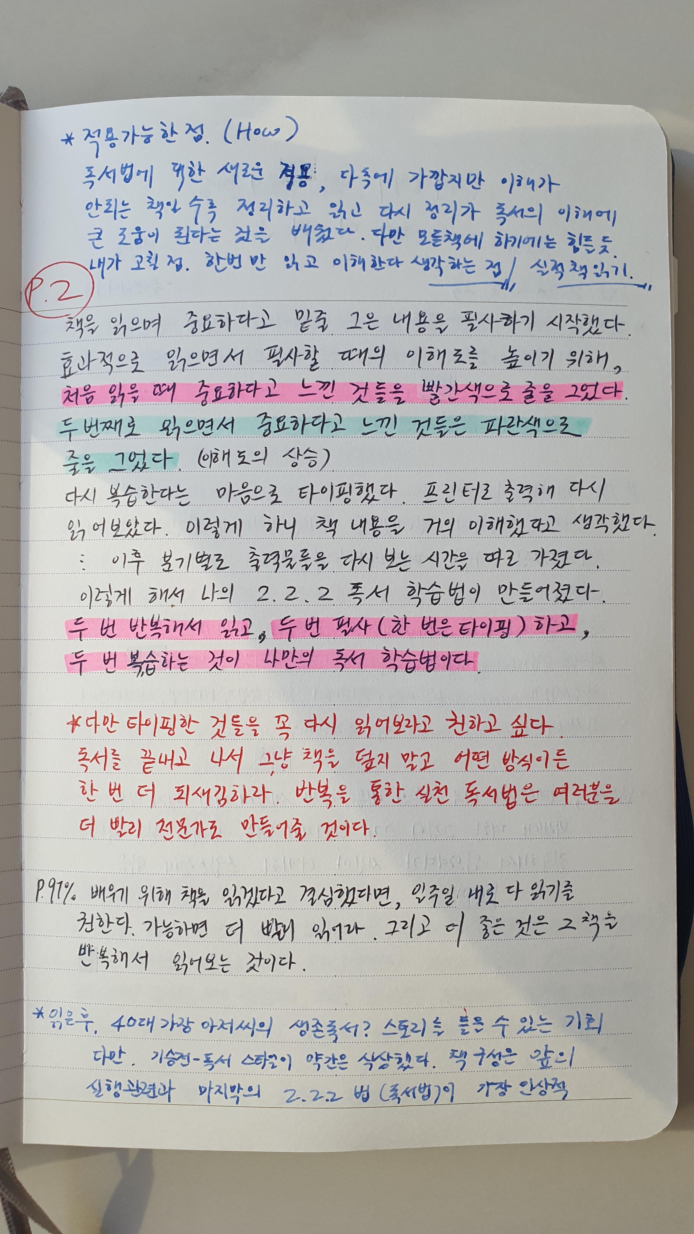 다시 복습한다는 마음으로 타이핑했다. 프린터로 출력해 다시 읽어보았다. 이렇게 하니 책 내용을 거의 이해했다고 생각했다. ... 이후 분기별로 출력물들을 다시 보는 시간을 따로 가졌다. 이렇게해서 나의 2.2.2 독서 학습법이 만들어졌다. 두 번 반복해서 읽고, 두 번 필사 (한 번은 타이핑)하고, 두번 복습하는 것이 나만의 독서 학습법이다.
