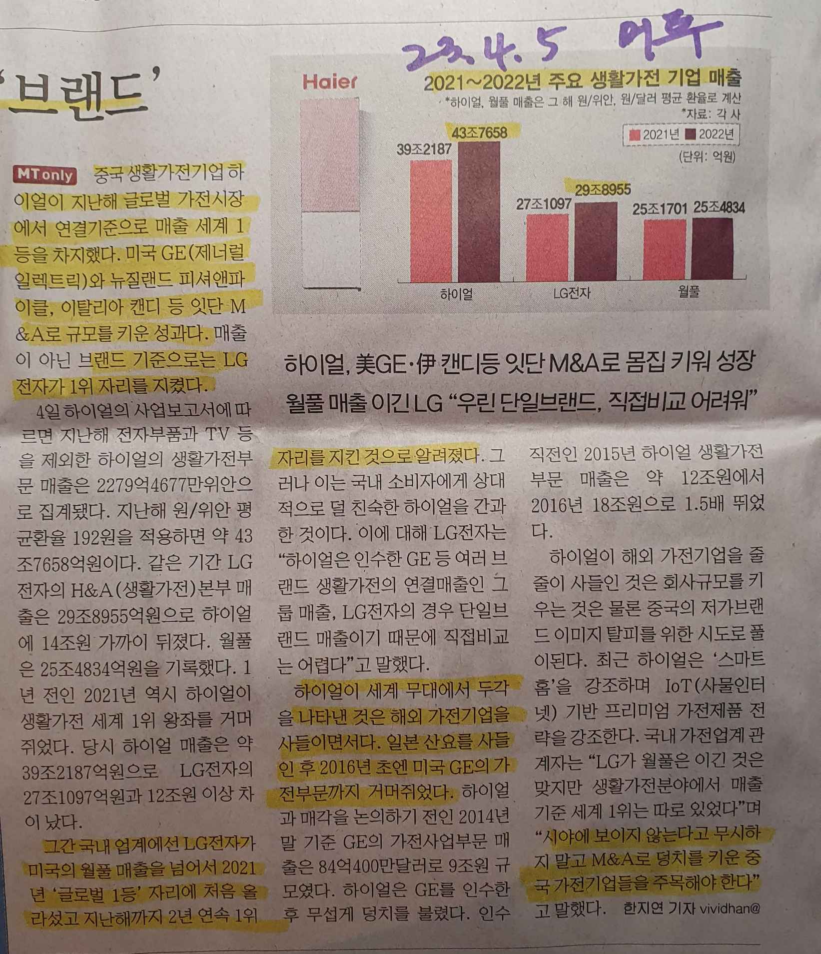 21-22년 생활가전 기업 매출, 하이얼이 1위였다니.. 23.4.5 머투