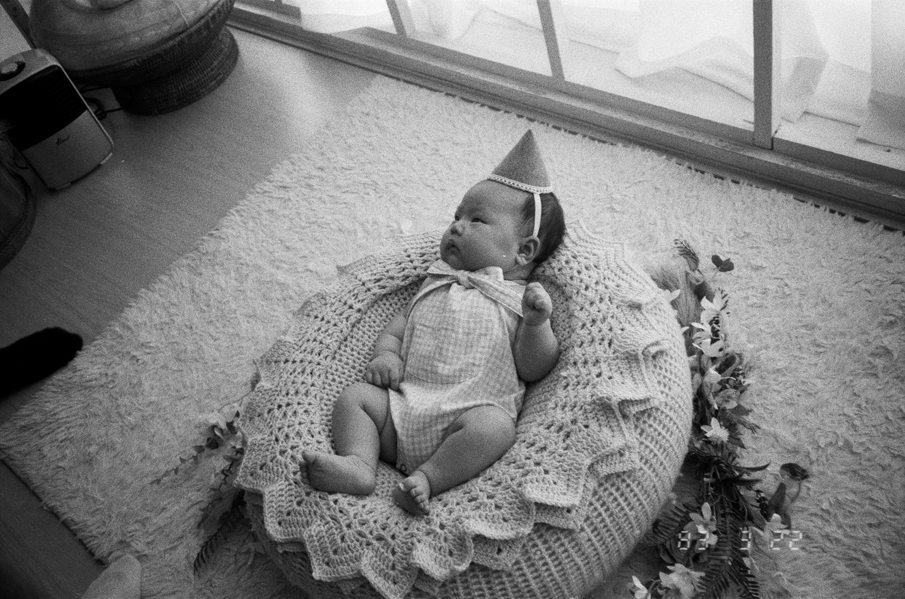 귀여운 꼬깔 모자를 쓴 딸.