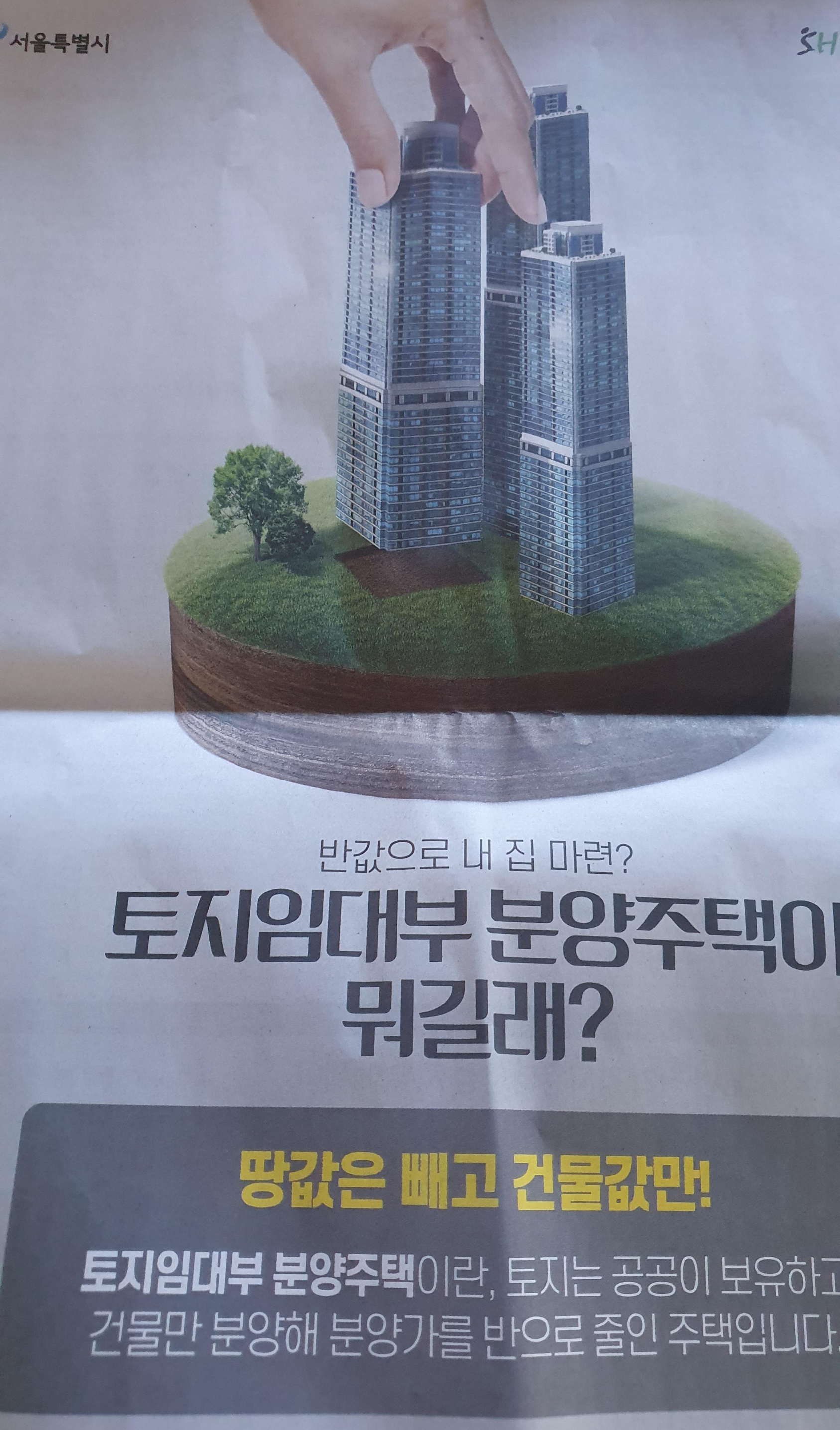 안녕하세요, 하코지코 입니다. 오늘은 신문을 보던 중 서울특별시와 SH 공사의 광고가 눈에 띄에 토지임대부 분양 주택이 어떤 제도인지에 대한 정보를 드리고자 합니다.