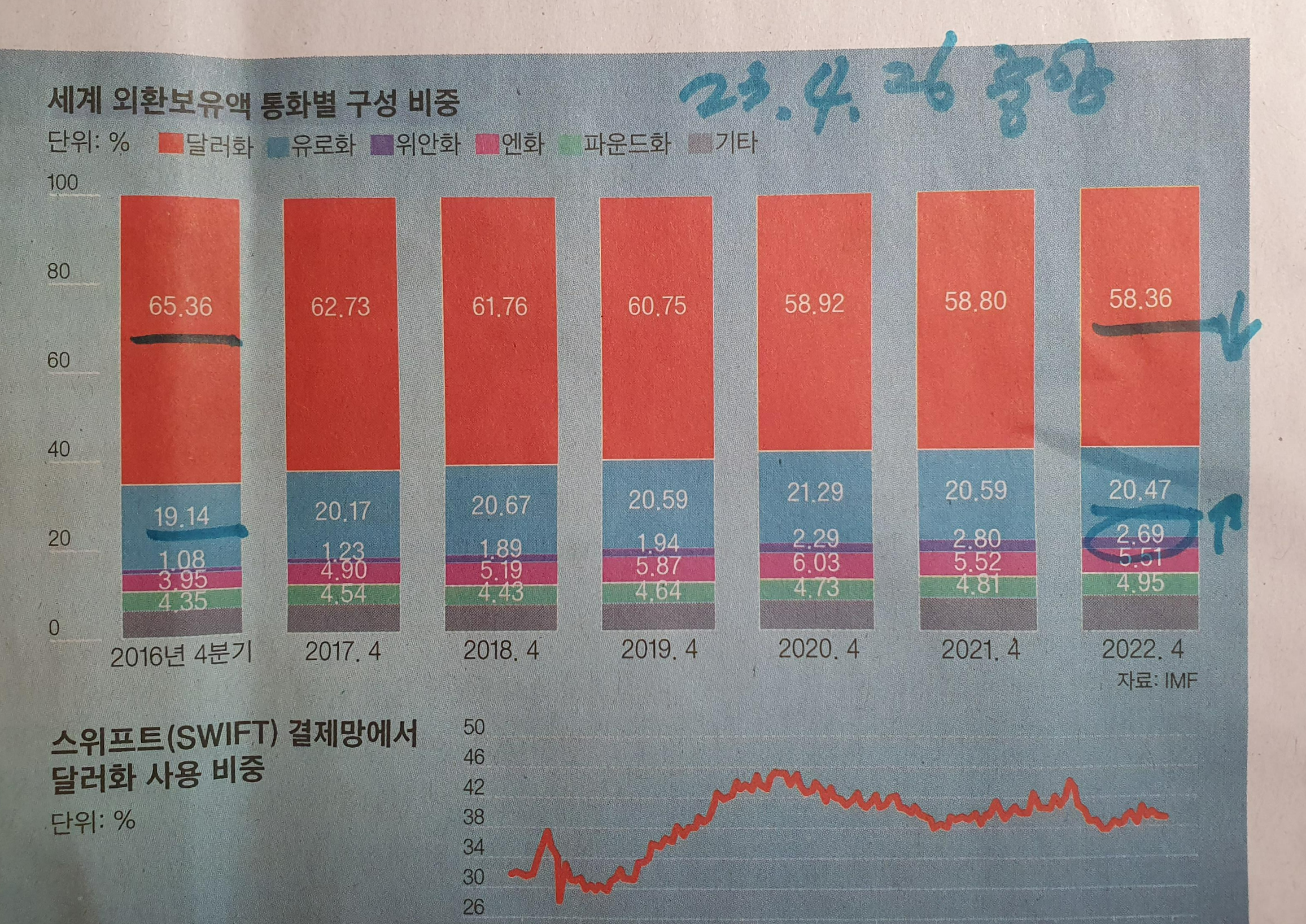 세계 외환보유액 통화별 구성 비중, 달러의 약세화가 눈에 띈다 23.4.26 중앙
