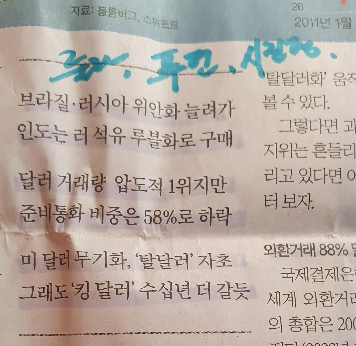 -다른 한편의 그림자로 '탈달러화' 움직임에도 불구하고 유로화나 위안화 등 다른 통화가 달러화의 자리를 빠르게 대체하지는 못하는 상황