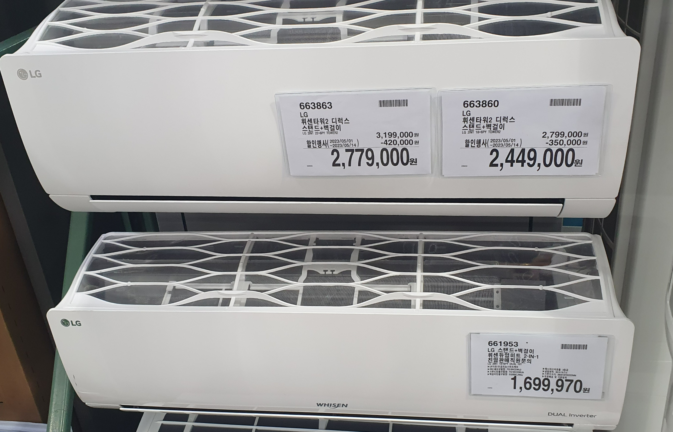 가격 라인업으로 보았을때 스탠드와 벽걸이를 함께하는 제품이 150만원대라는 것은 가성비적으로 최고의 선택이라 생각. 다만 디자인적으로 몇 년전 스타일이라는 것이 (최근의 에어컨들은 에어컨이라는 형태를 자세히 보여주기보다는 인테리어 제품처럼 거실과의 조화스러운 디자인에 좀더 초점을 맞춘 듯한 제품들이 많았다.)