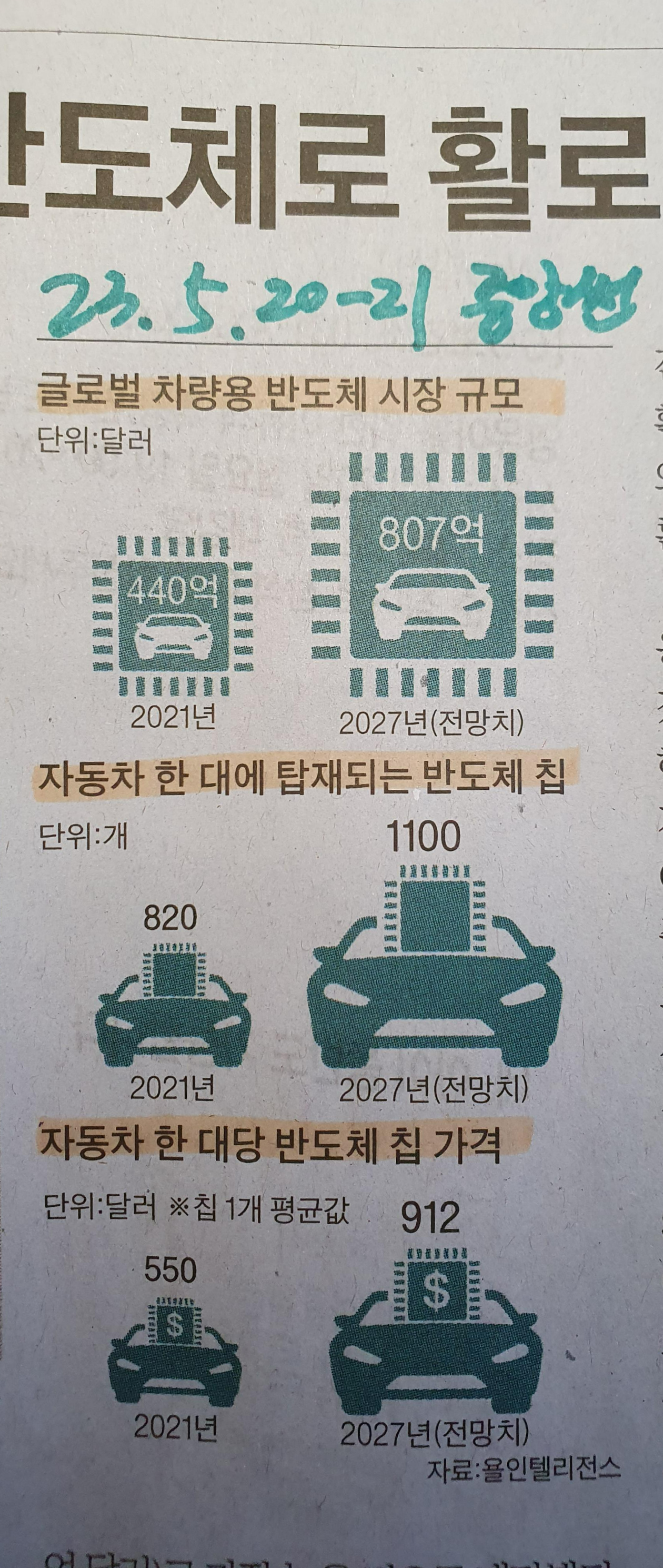 차량용 반도체 시장 규모, 자동차에 탑제되는 반도체 수, 칩 가격 23.5.20-21 중앙