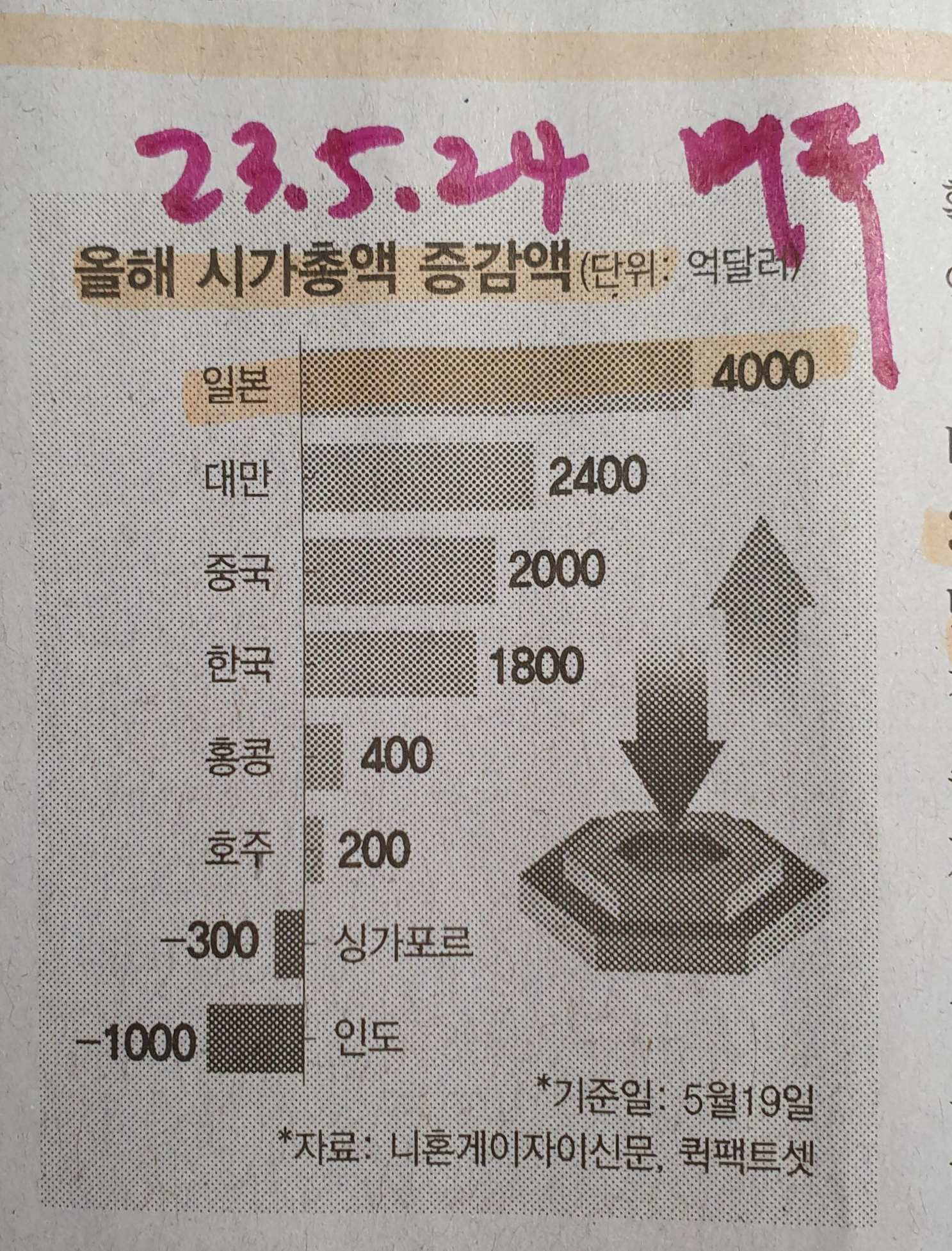 국가 별 시가총액 증감액 일본,대만,중국,한국,홍콩,호주,싱가포르,인도 #일본의 재발견? 23.5.24 머투