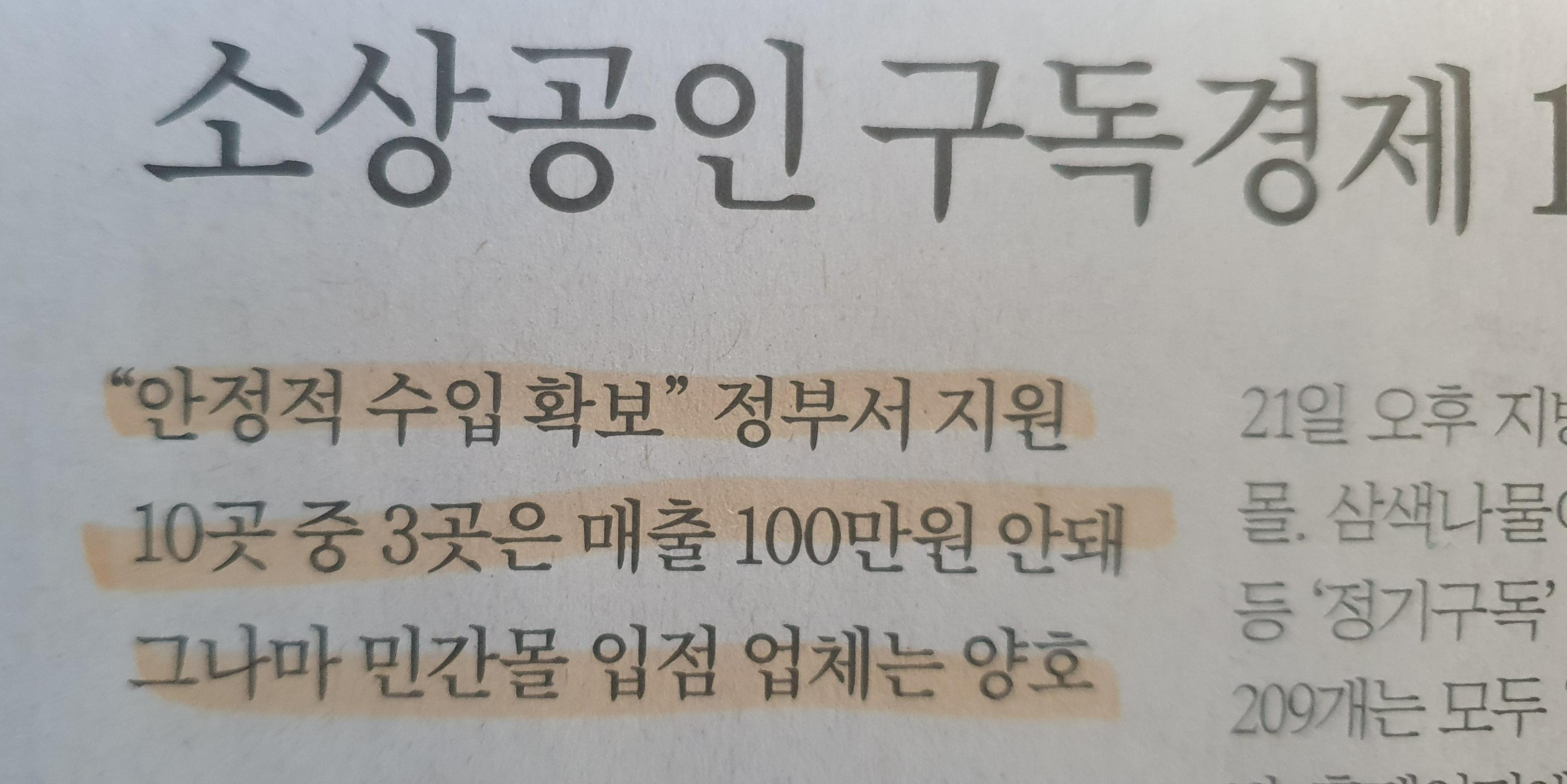 -하지만 10곳 중 3곳은 매출 월 100만원이 안 되는 상황, 더욱 큰 상황은 매출 0원인 곳도 32프로에 달한 다는 점이다 결국 60프로 이상의 소상공인은 구독경제를 통해 100만 원도 안 되는 매출액이라는 것이다.