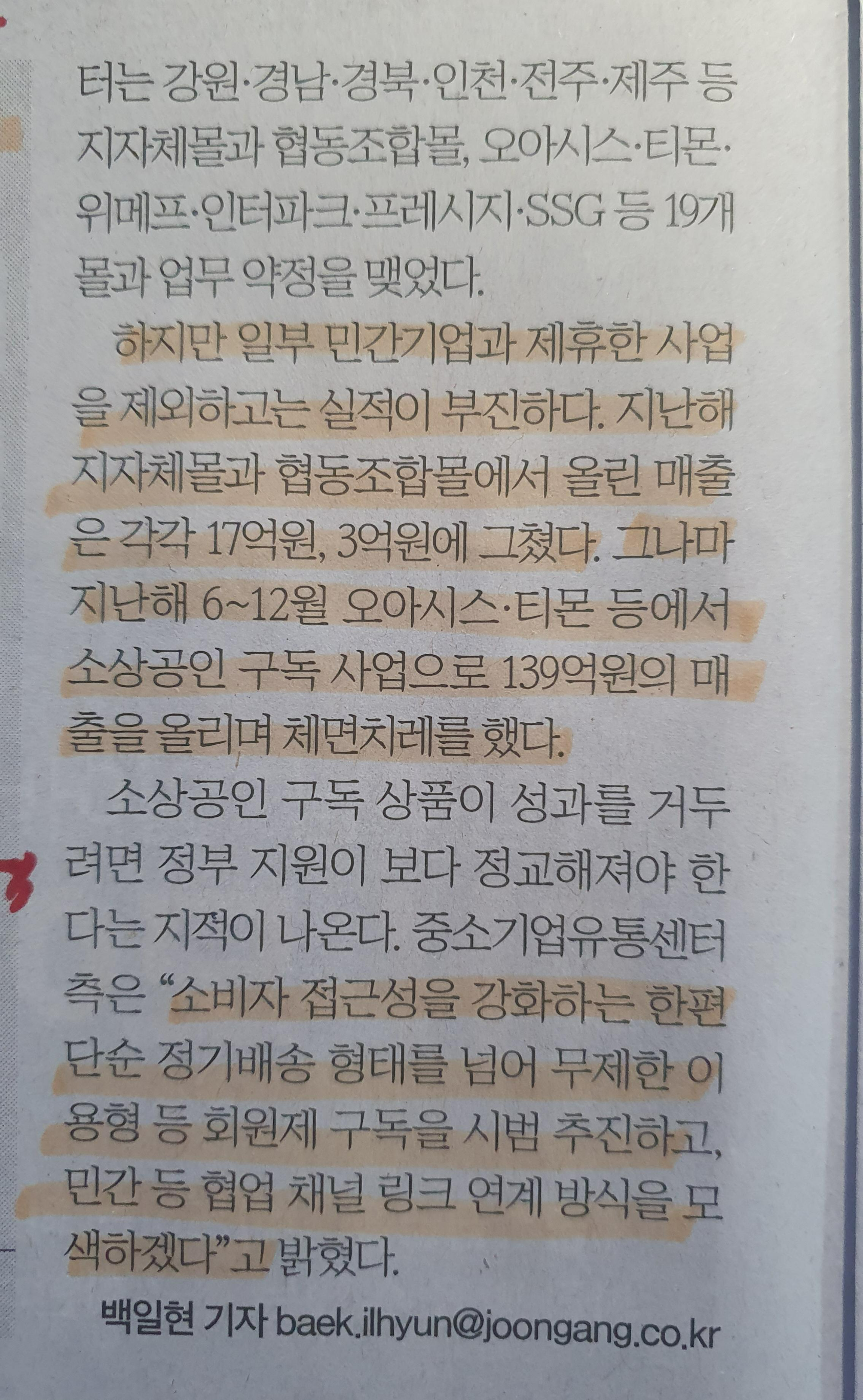 -그나마 브랜드 있는 공동구매 업체나 유기농 전문 업체인 오아시스나 티몬 등에서 소상공인 구독 사업으로 139억의 매출을 올리며 프로그램에 대한 체면치레를 유지해준 정도이다.