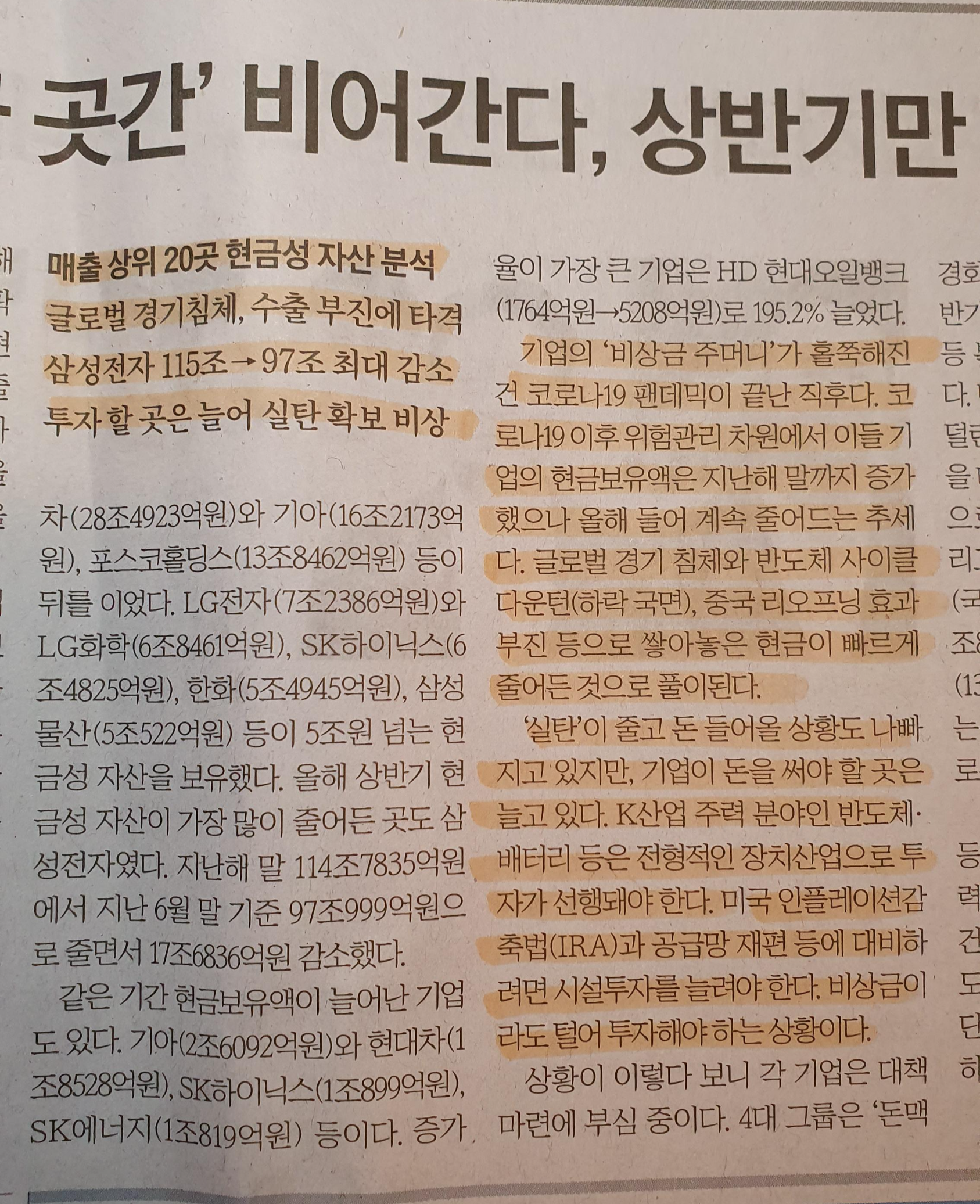 Comment)) 코로나 시기 벌었던 돈들을 이제 토하고 있는 중. 그래도 대기업은 대기업이구나 생각이 든다. 20대 기업까지는 현금 보유만 대부분 1조 원 이상이라는 부분이 다르구나 싶었다.