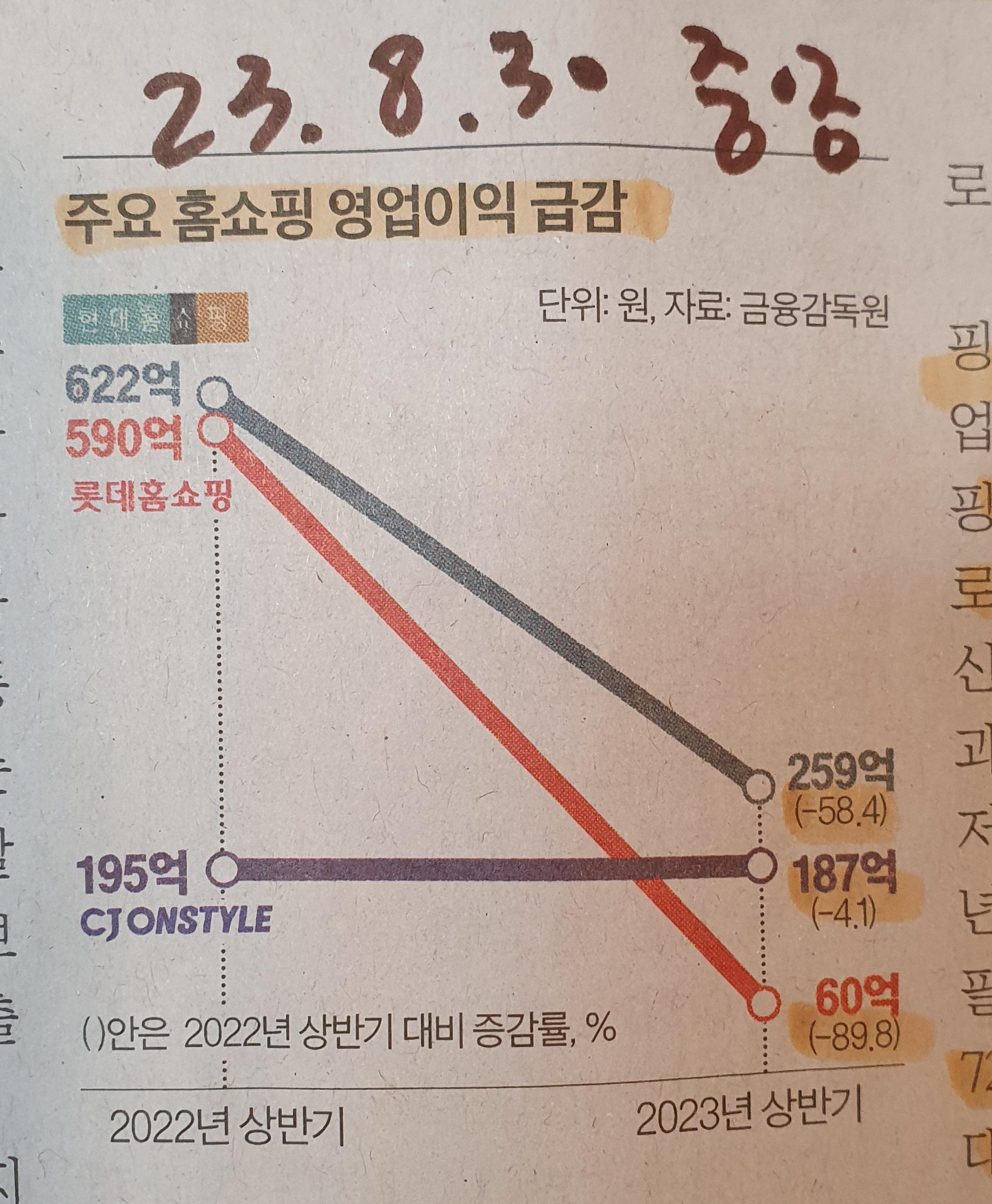 홈쇼핑 영업이익 급감, 유료 방송 송출 중단 요청 23.8.30 중앙