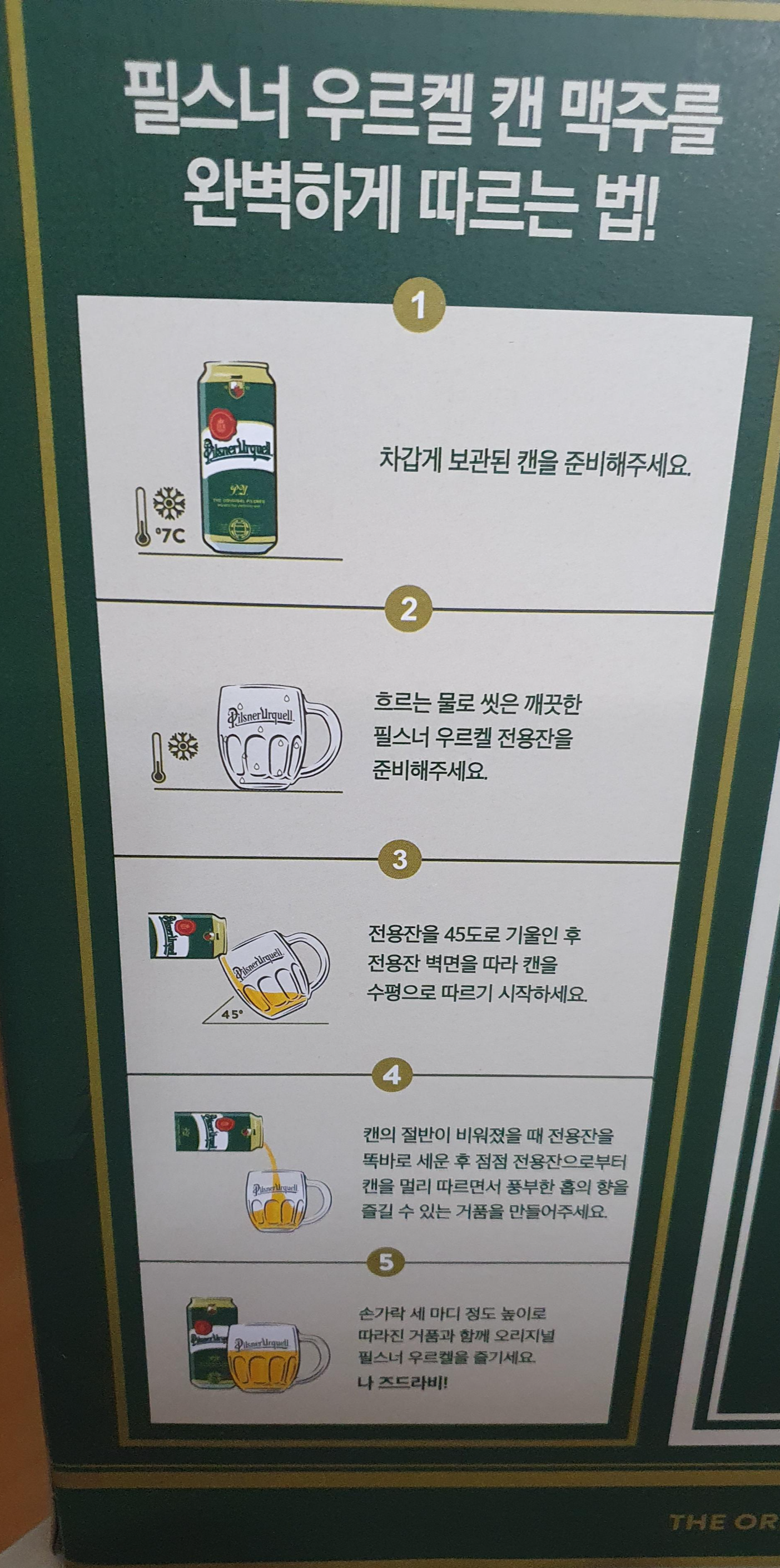 제품 옆면에 필스너 우르켈 캔 맥주를 완변하게 따르는 법! 에 대한 팁이 있네요.