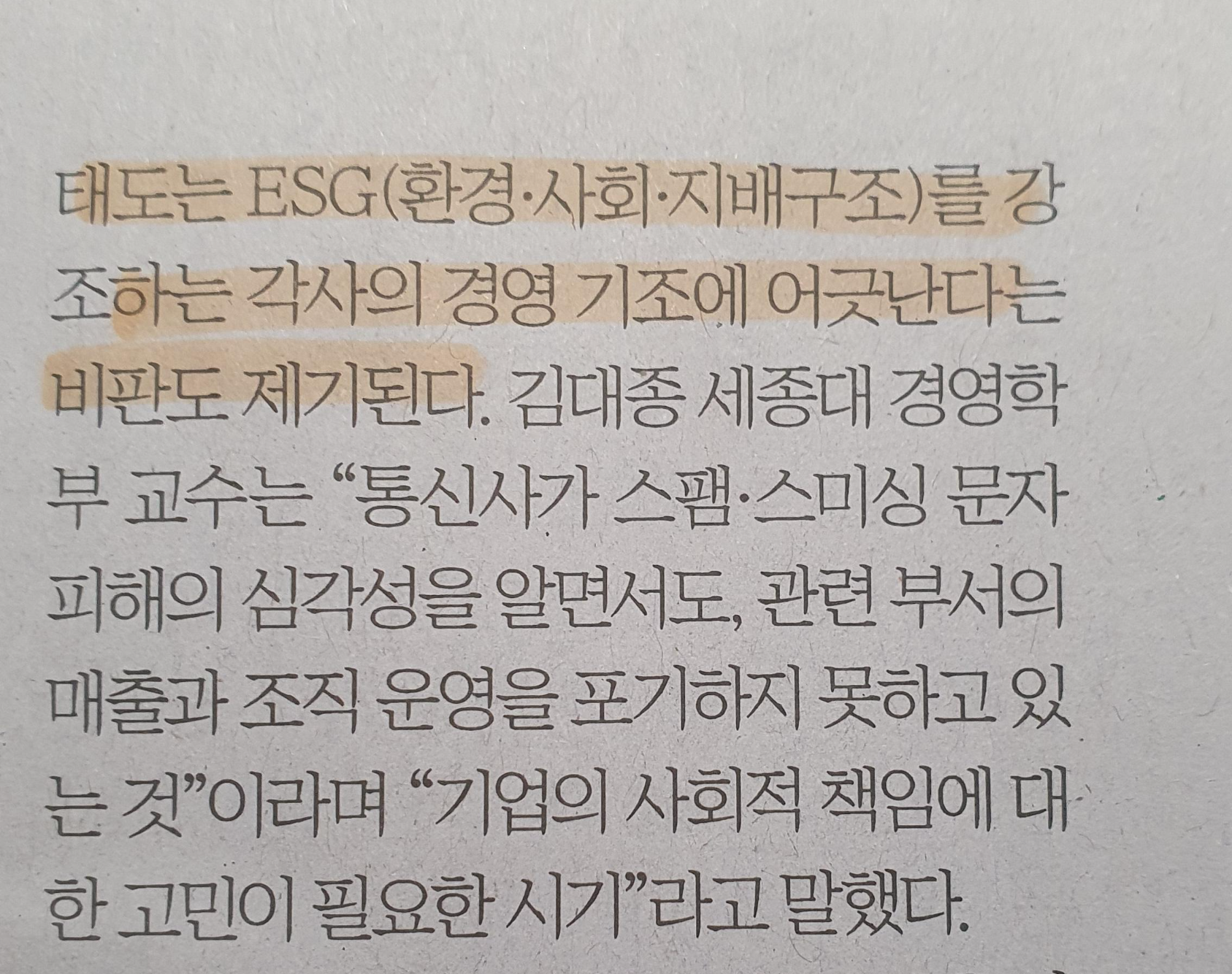 - 기업의 EGS (환경, 사회, 지배구조) 등 기업 환경적인 올바른 기업으로서의 명분을 강조하는 것이 최근의 기조인데 이러한 스팸 문자의 방관은 각사의 경영 기조에 어긋난다는 비판도 제기