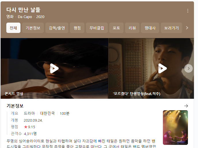 제목 '다시 만난 날들' 아.. 상업 영화라기보다는 독립 영화 스타일의 영화를 100분이라는 장편 영화로 본다는 것이 최근의 영상 시청 매너리즘과 유튜브의 영향 때문인지 영화를 보는 것이 가능할까 싶은 생각이었지만 생각보다 재미의 포인트가 다양했던 영화였다. 100분이라는 시간을 바람 불듯 지나가는 것이 아닌 노스탤지어에 대해 곱씹으며 아련히 보는 재미가 있었던 영화로 기억될 것 같다.