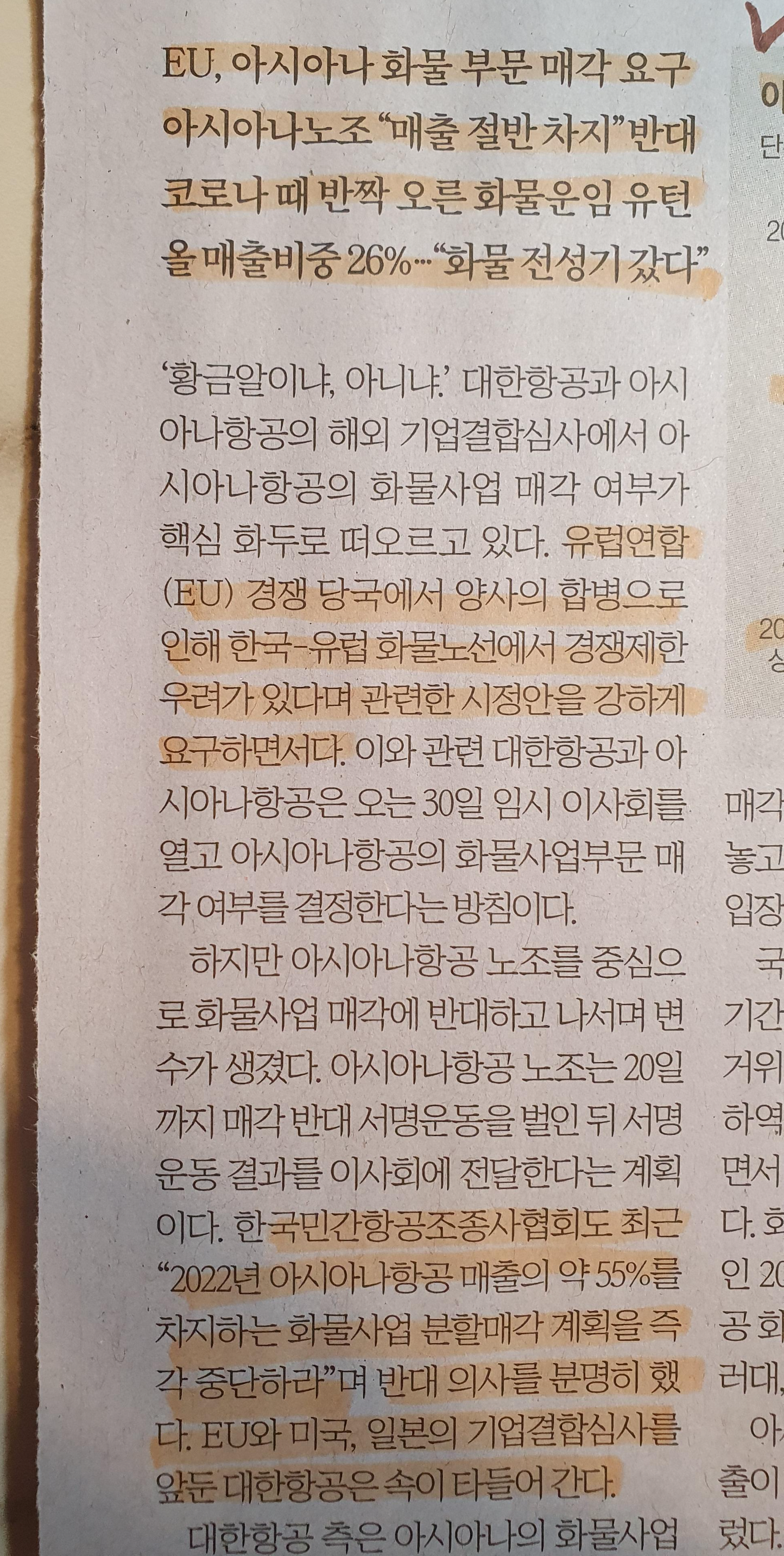 -인수협상의 막바지 장애물, EU 아시아나 화물 부문 매각 요구, 아시아나의 비중이 한국 시장의 20프로 정도 아시아 시장의 경우 절반 가까운 점유율을 차지하기에 노조에서는 반대하는 입장.