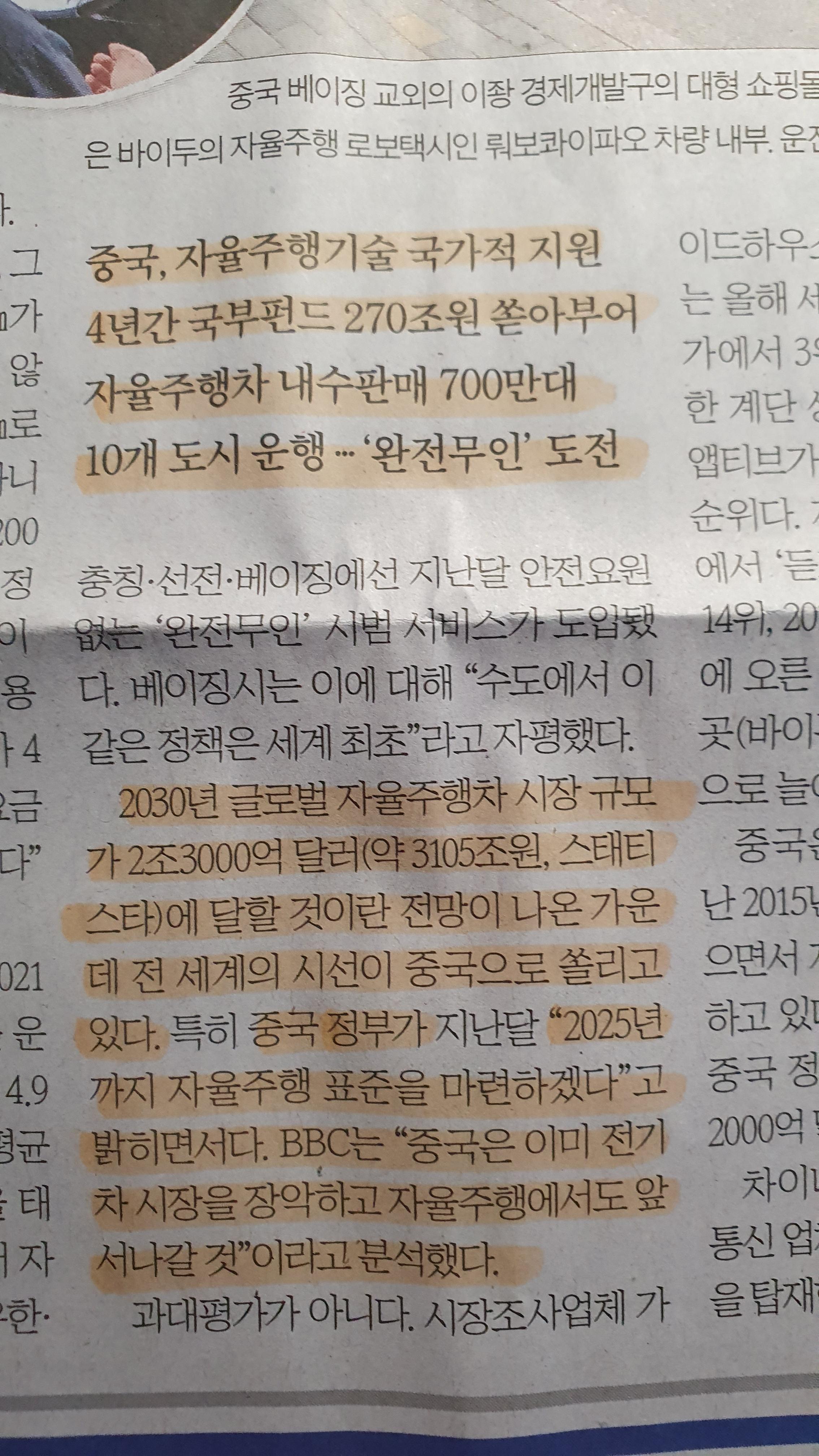 -중국, 자율주행기술 국가적 지원 4년간 국부펀드로 270조원 쏟아부은 국책사업으로 발전