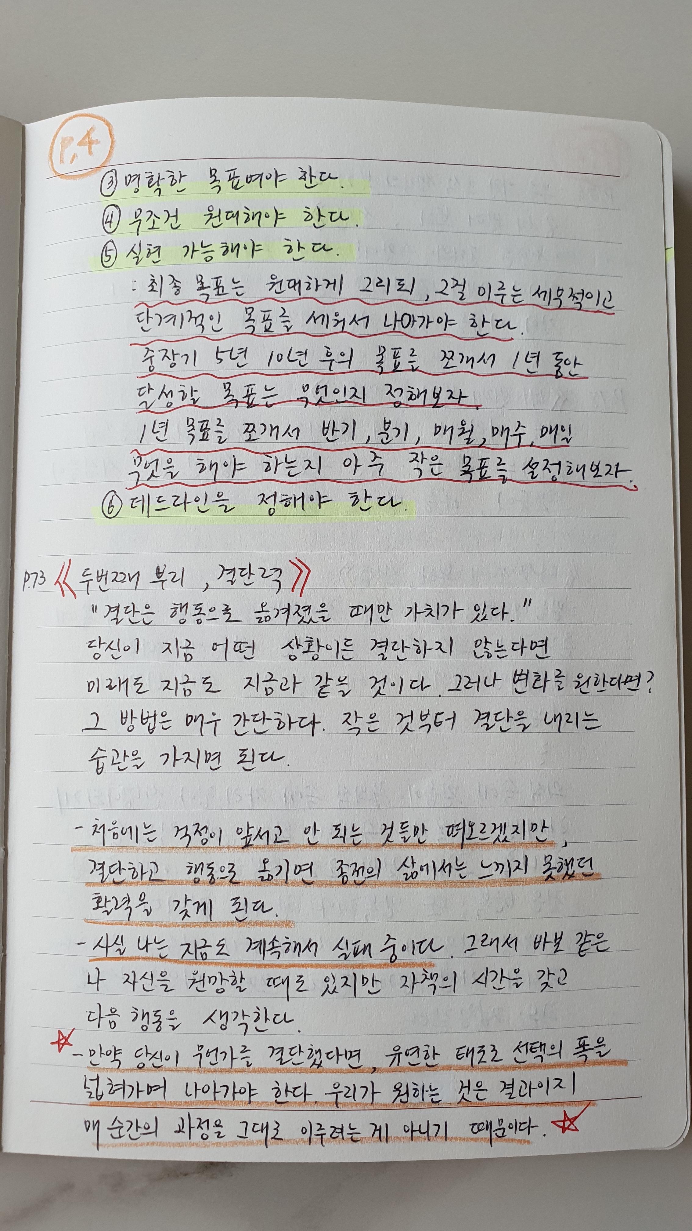 HakoJico COMMENT)) 이 후의 내용은 실천을 할 수 있는 방법론에 대한 순차적인 지침서였다. 책을 읽다보면 머릿속에 드는 생각 " 이건 나도 알고 있었잖아?" 하지만 실천이 부족하거나 나태함에 기대어 미루는 것들이였다. 작가 켈리 최님은 이 부분을 한꺼번에 고칠 수는 없더라도 마인드셋 목표설정 그리고 실천의 순차적인 방법을 통해 자신의 변화를 만들 수 있다 말하고 있다.