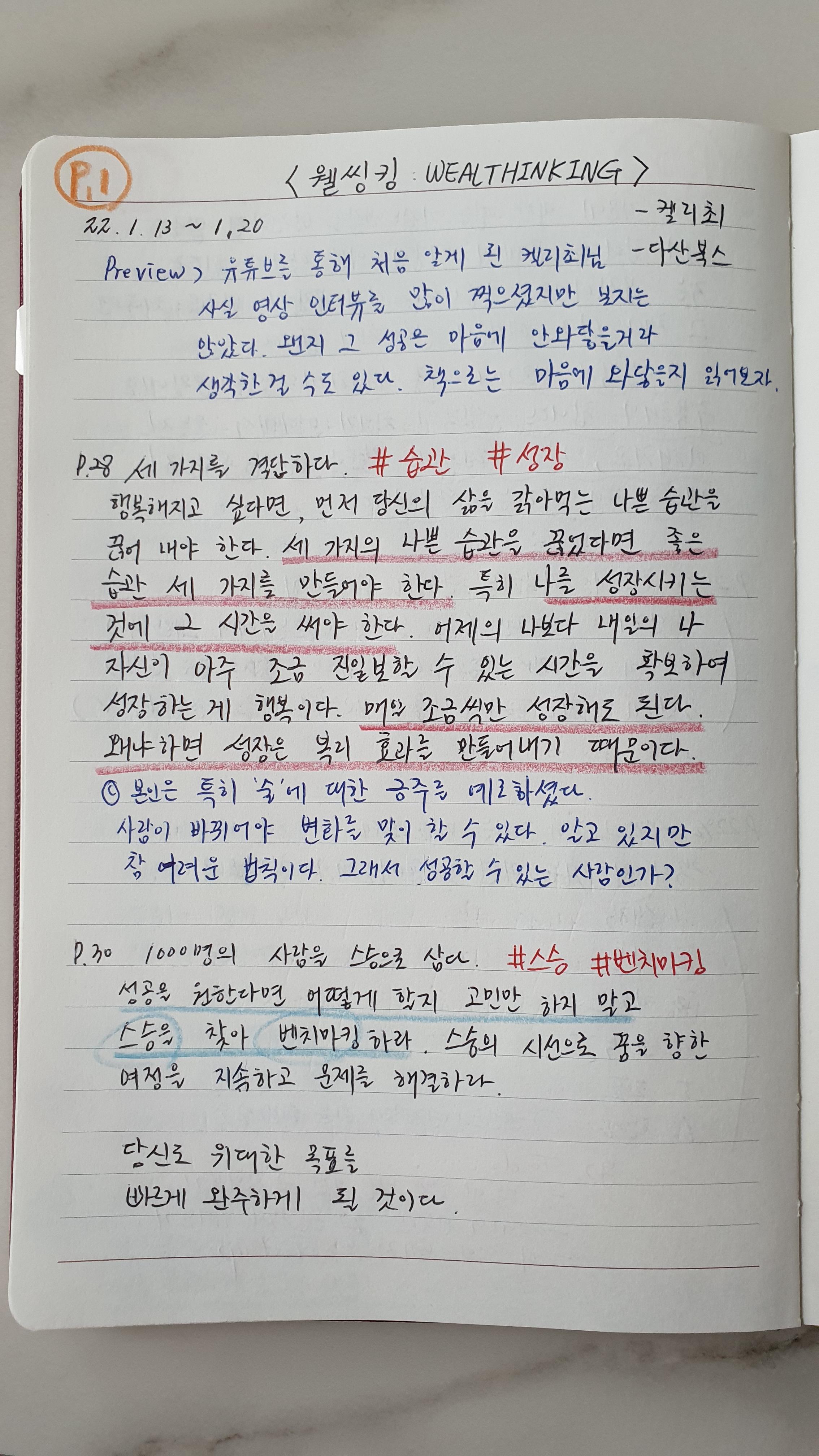 모든 것은 노력과 준비를 하다보면 그 때를 만나게 되는 것이고 그 떄를 만나기 위해서는 매일 매일 새롭게 변화를 가지고 실천하는 것이 중요하다는 것을 시간이 지나며 깨달았다. 내가 20대 혹은 30대 초반에 이책을 읽었다면 한 번 읽고 덮었을 것이다. 하지만 지금의 시간이 지난 내가 읽은 웰씽킹 책은 좋은 교본이 되었다고 생각한다. 그래서 곁에 두고 자주 읽어보면 생각과 신념의 이탈에 큰 길잡이가 되어줄 책이라 생각되었다.