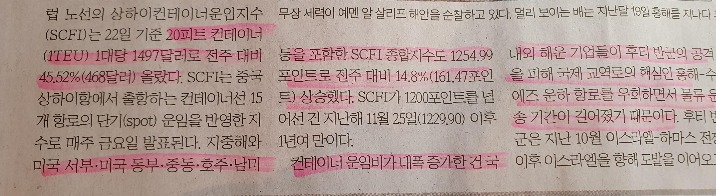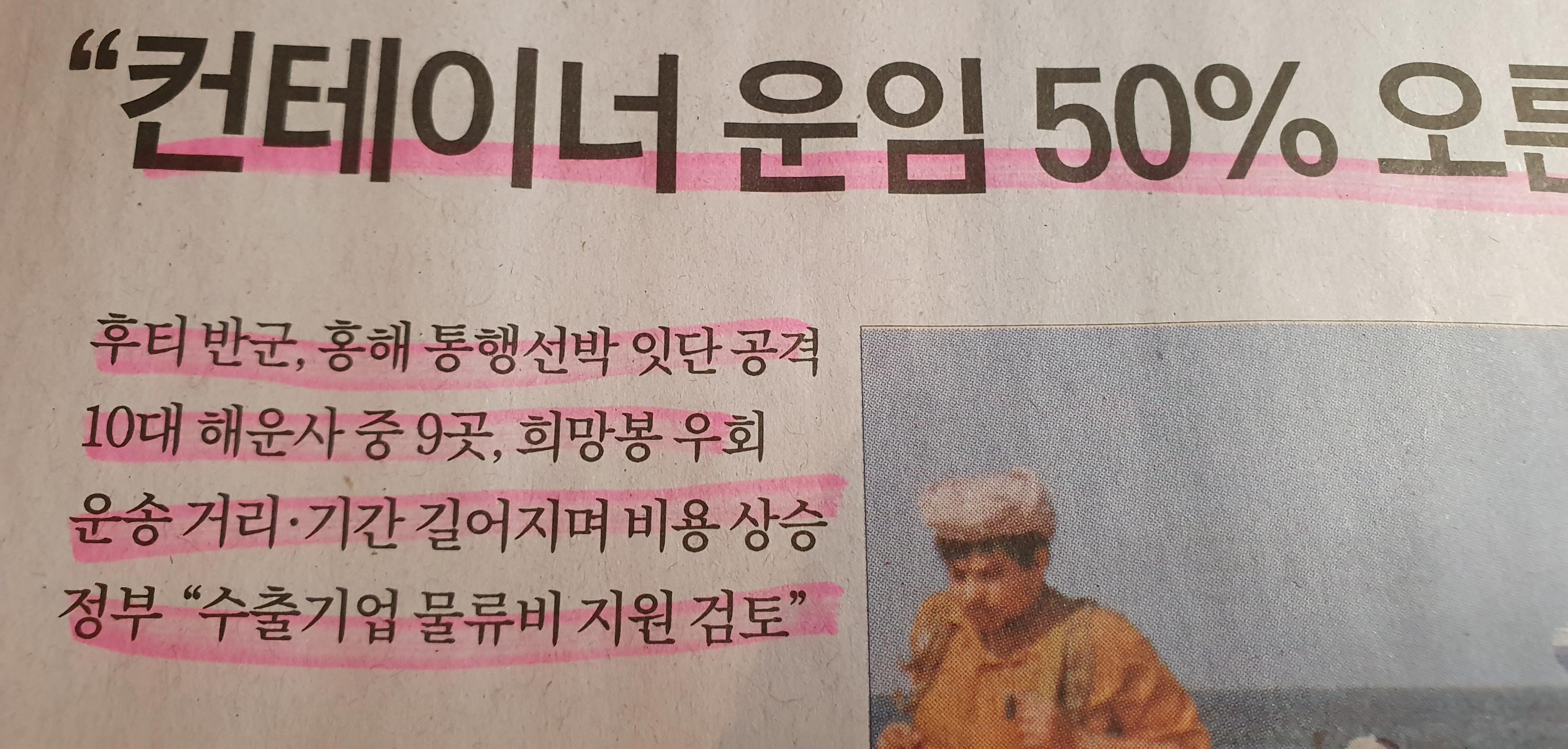 Comment)) 이러한 변수는 잔잔하던 호수가에 돌 하나를 던지는 것과 같다 멀리는 잔잔히 퍼지는 파동처럼 이러한 상황이 지속된다면 전 세계적인 운임 및 항공운임에 영향을 미치는 부분이다. 예전 몇 년 전 수에즈운하에 멈춘 배로 인하여 큰 영향을 끼친 적이 있었던 만큼 이러한 수에즈 운하 운영에 눈이 간다. 물론 이후의 뉴스에서 공격을 호위하기 위한 방법을 강구 중이며 최대해상 기업인 머스크에서 수에즈 운하 운항이 다시 들어간다는 것을 보아서는 길게 이러한 상황이 유지되지는 않을 것으로 예상된다.