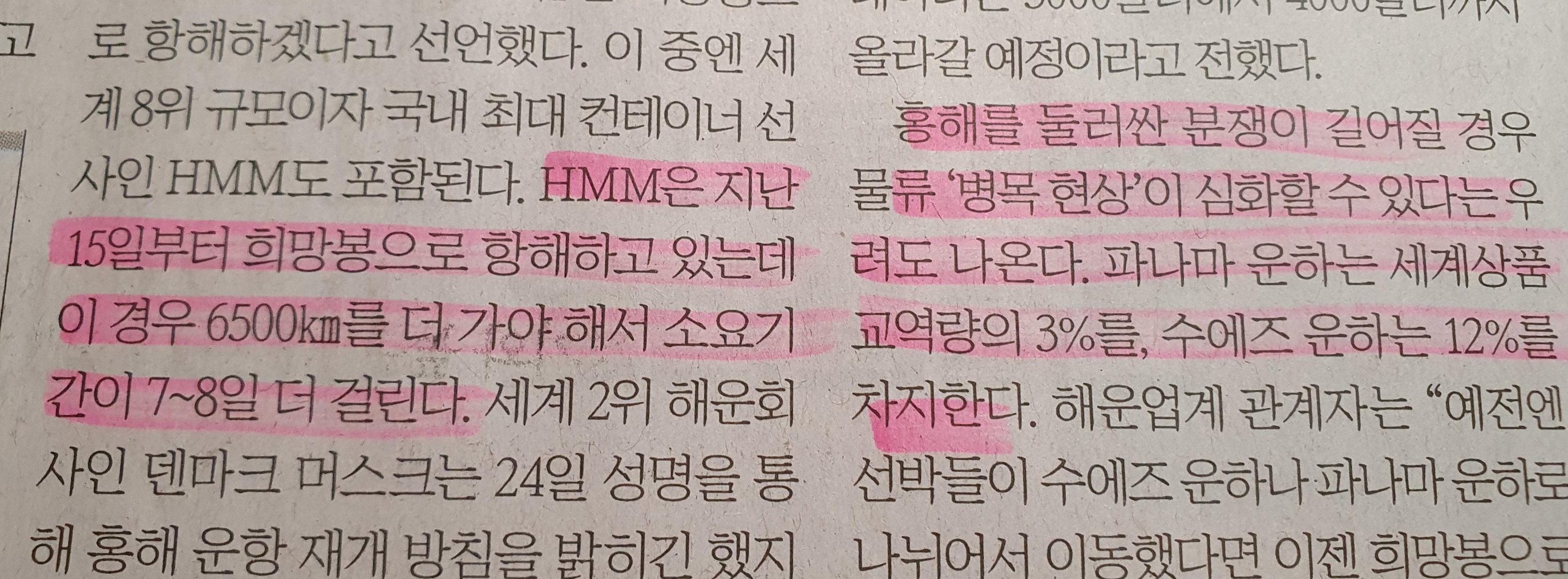 -우회되는 거리는 수에즈 운하 대비 희망봉으로 가는 경우 6500km를 더 운항해야 하기에 선적 일자 및 비용이 더욱 늘어날 것으로 예상