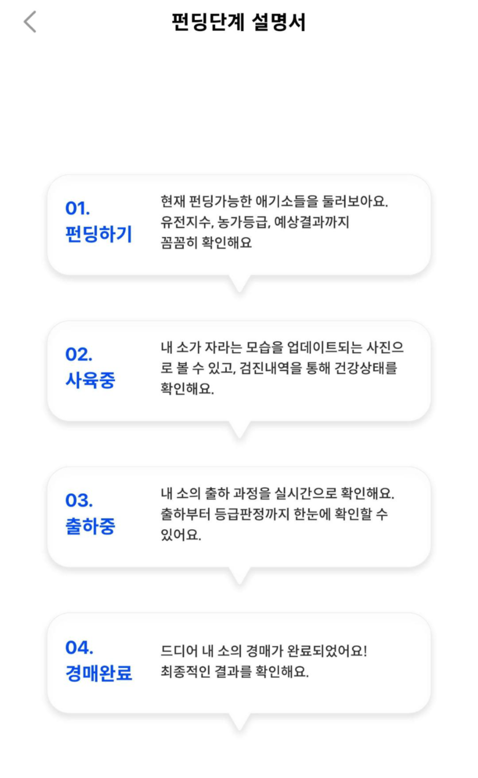 4가지 단계에 따라, 진행되며 크라우드 펀딩 스타일인 관계로, 투자 오픈이 되면 일정 기간동안 투자가 가능하며 closed 되어 사육이 진행 됩니다. 그래서 오픈 시기를 맞춰 소시장 방문하듯 소를 고르는 것이지요.