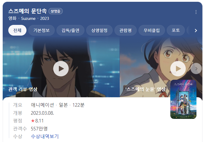 2023년 신작 애니메이션 스즈메의 문단속의 557만 명의 관객의 이러한
