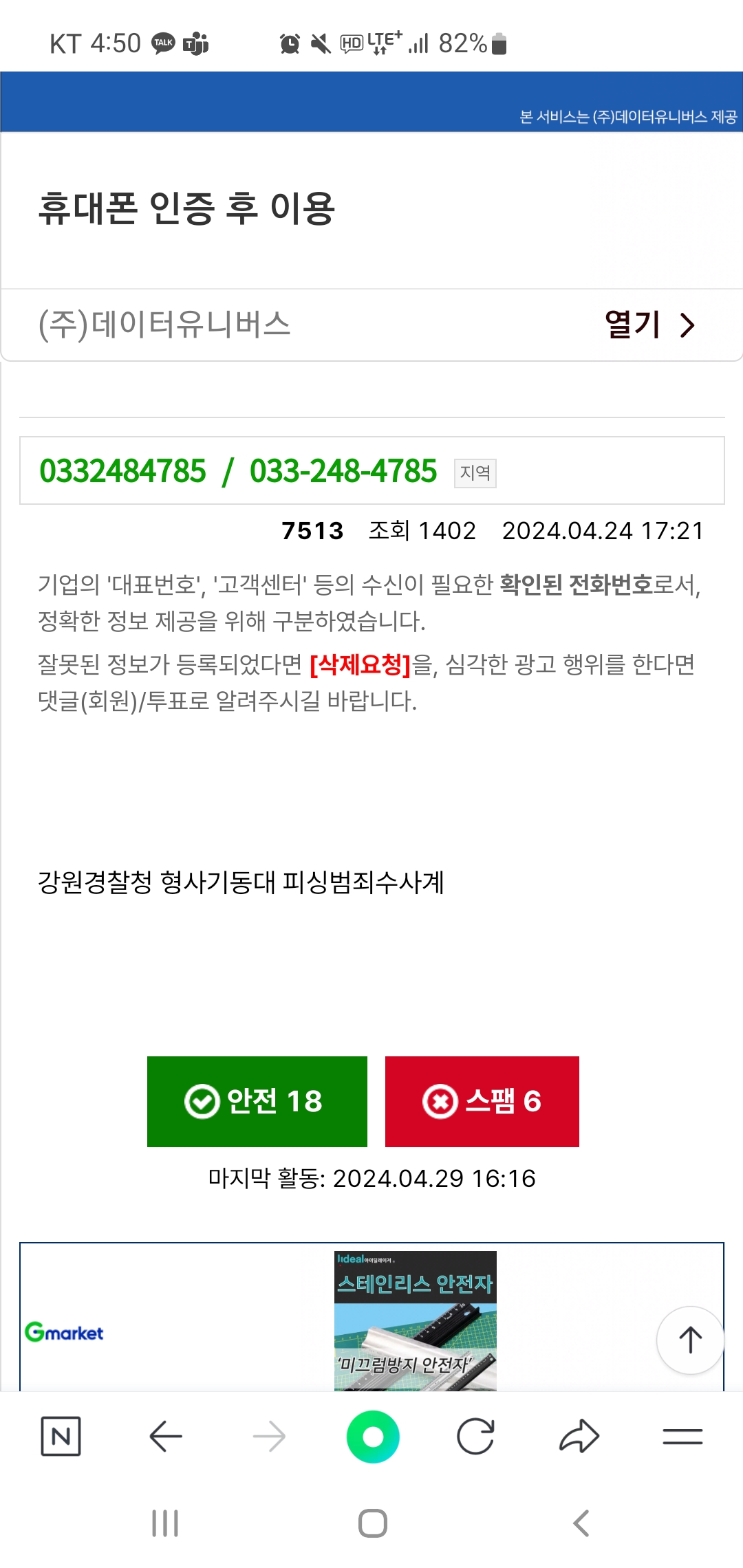 이건진짜 경찰청 문자였네? 033-248-4785 강원도 경찰청 피싱범죄수사계