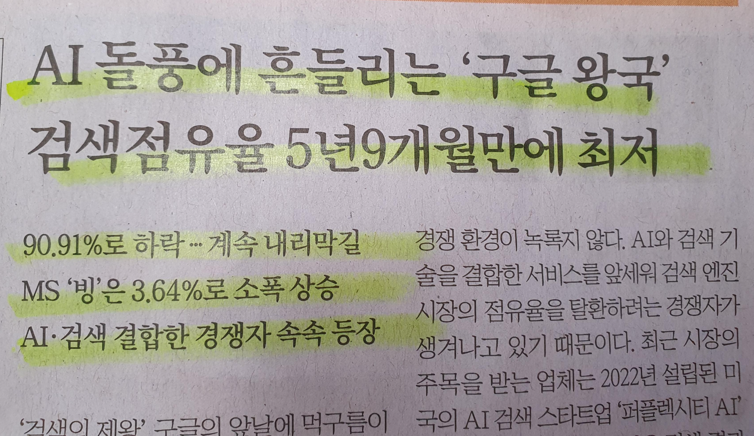 구글 왕국의 균열, 검색시장 점유율 급락 및 빙bing의 상승 24.5.7 중앙