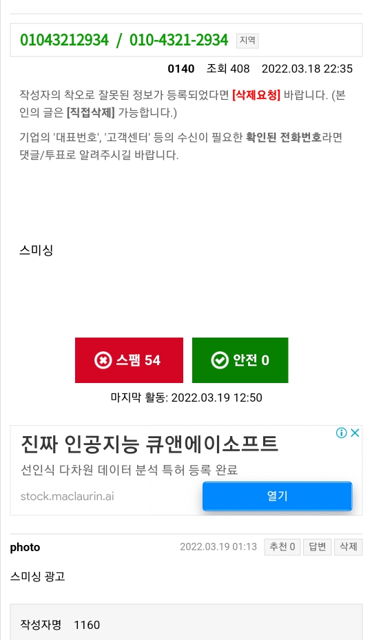 번호를 검색해보니 이미 스팸54건으로 압도적 지지를 받고 등록된 번호로 나오네요.