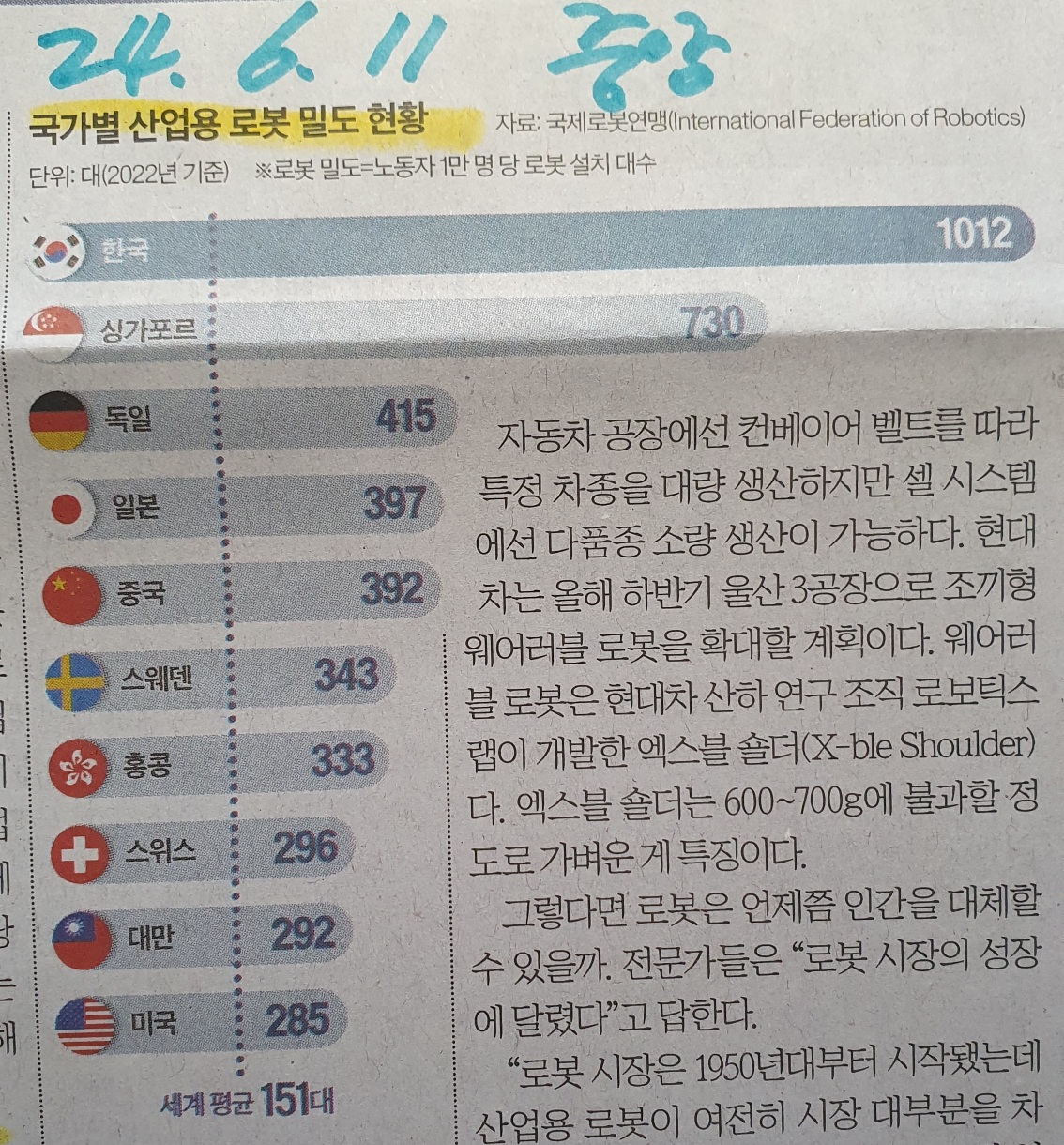 대한민국 산업용 로봇밀도 순위는? 로봇,토지,자본의.시대가 다가오는걸까.. 24.6.11 중앙