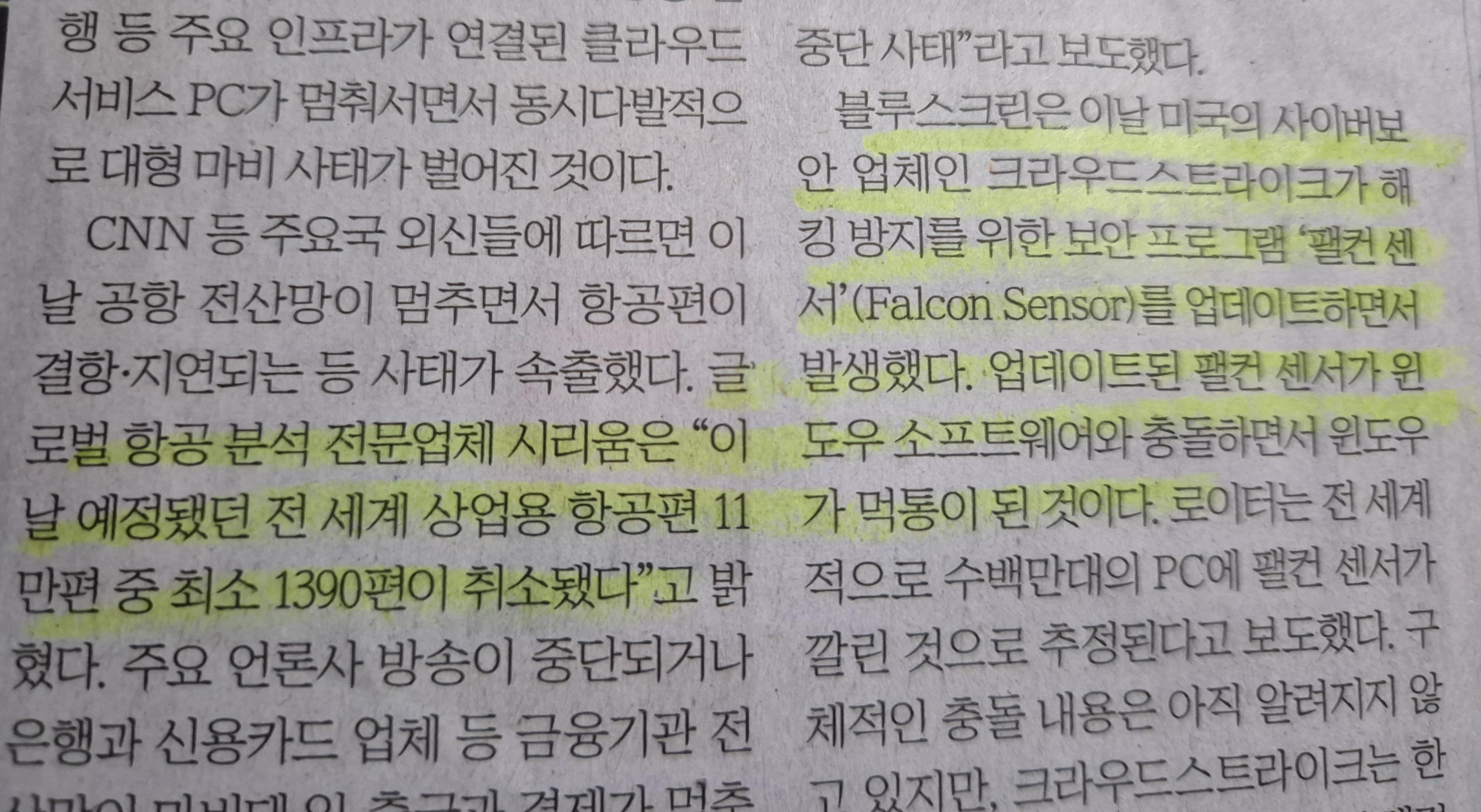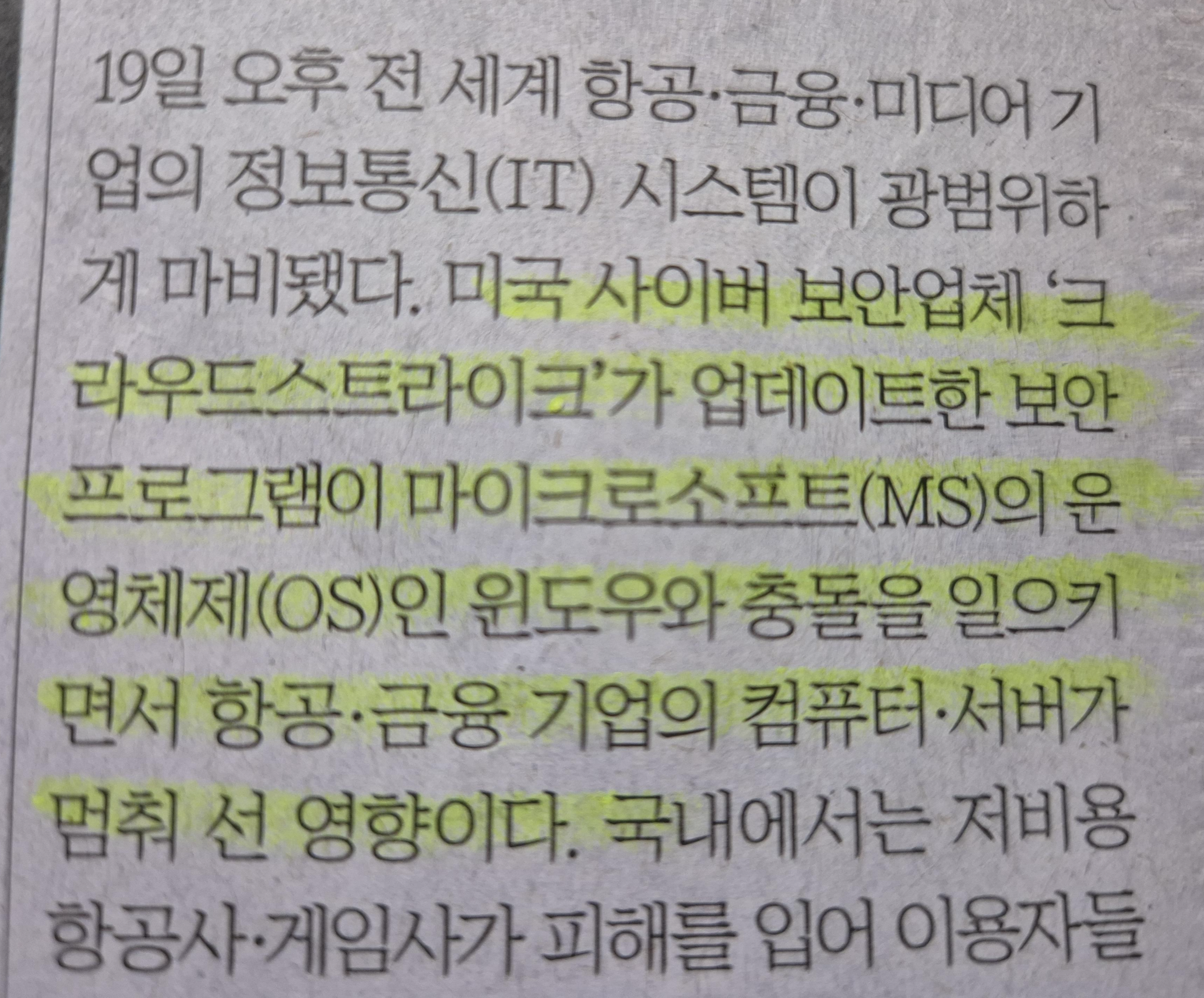 -원인은 미국 사이버 보안업체 크라우드스트라이크가 업데이트한 보안 프로그램인 ms의 운영체제인 윈도우와 충돌을 일으키면서 항공, 금융 기업의 컴퓨터 서버가 멈춰 선 상황이었다.