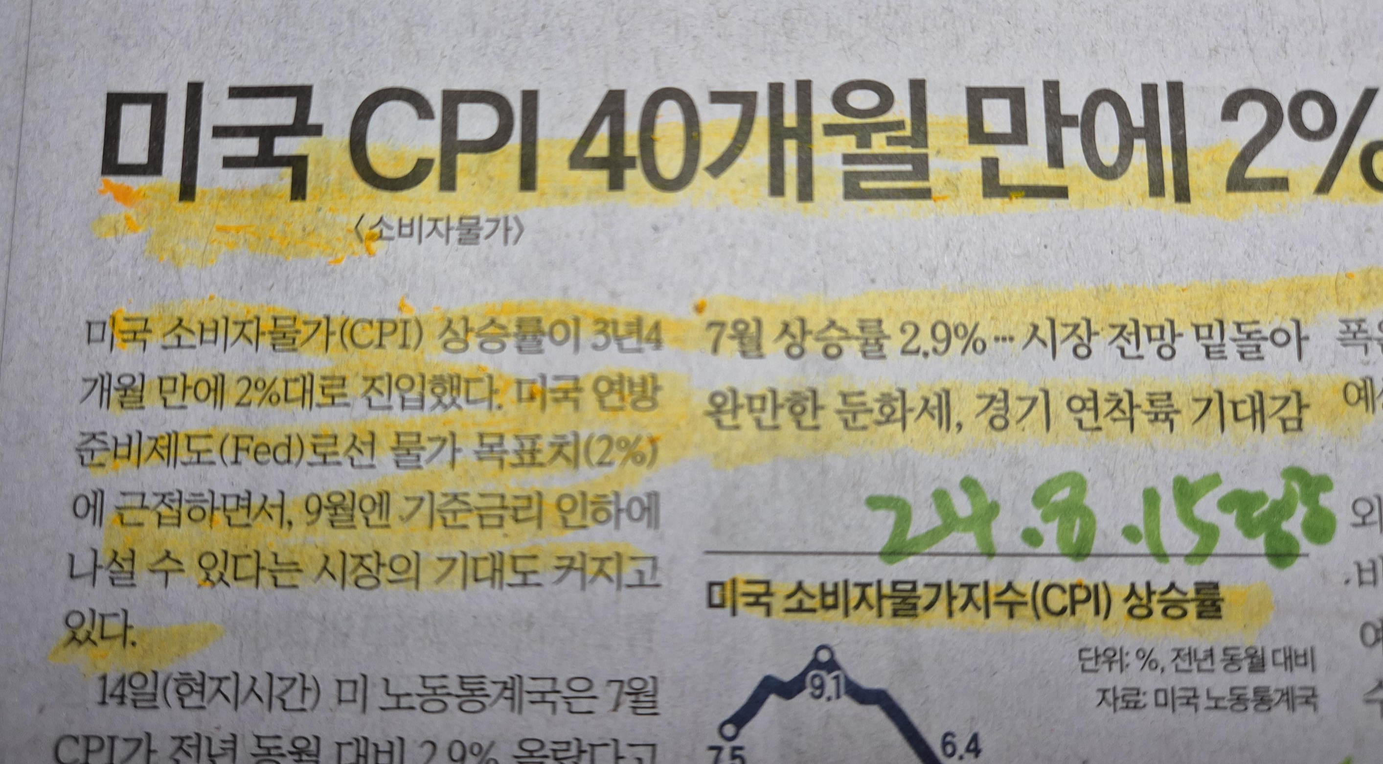 24년 7월 미국 소비자물가지수(CPI) 발표, 드디어 2.9% 최저치로 24.8.15 중앙