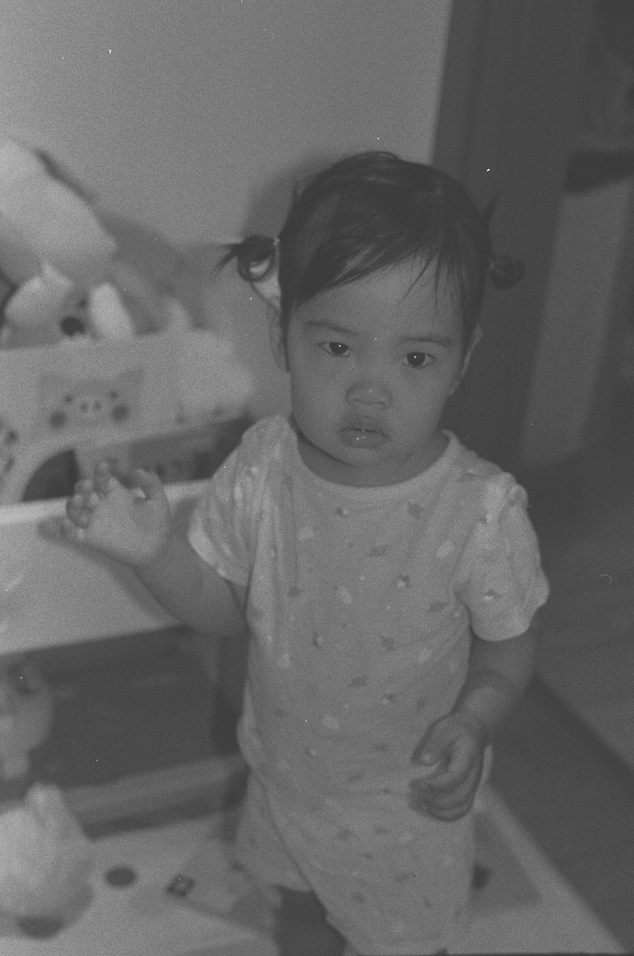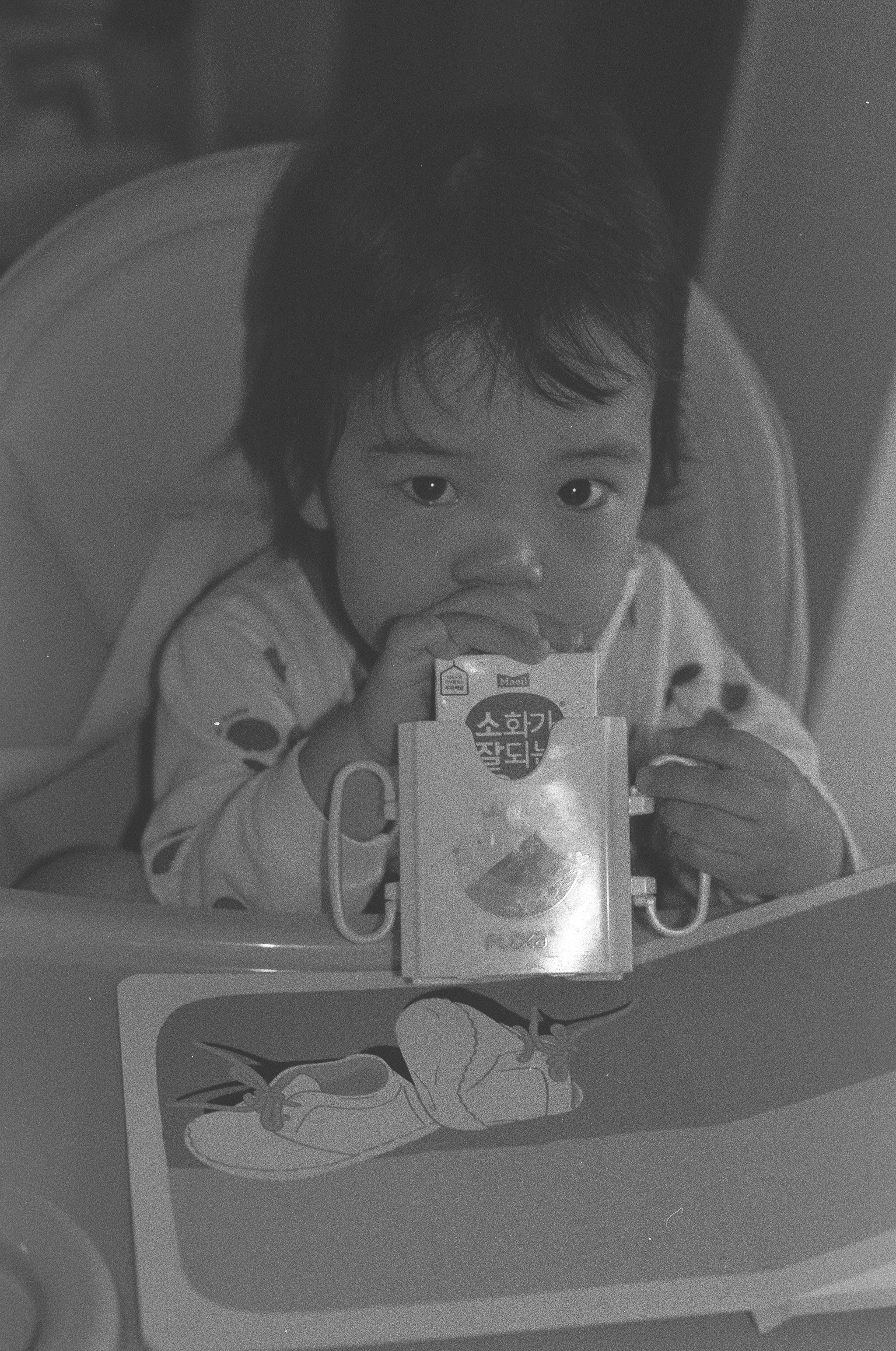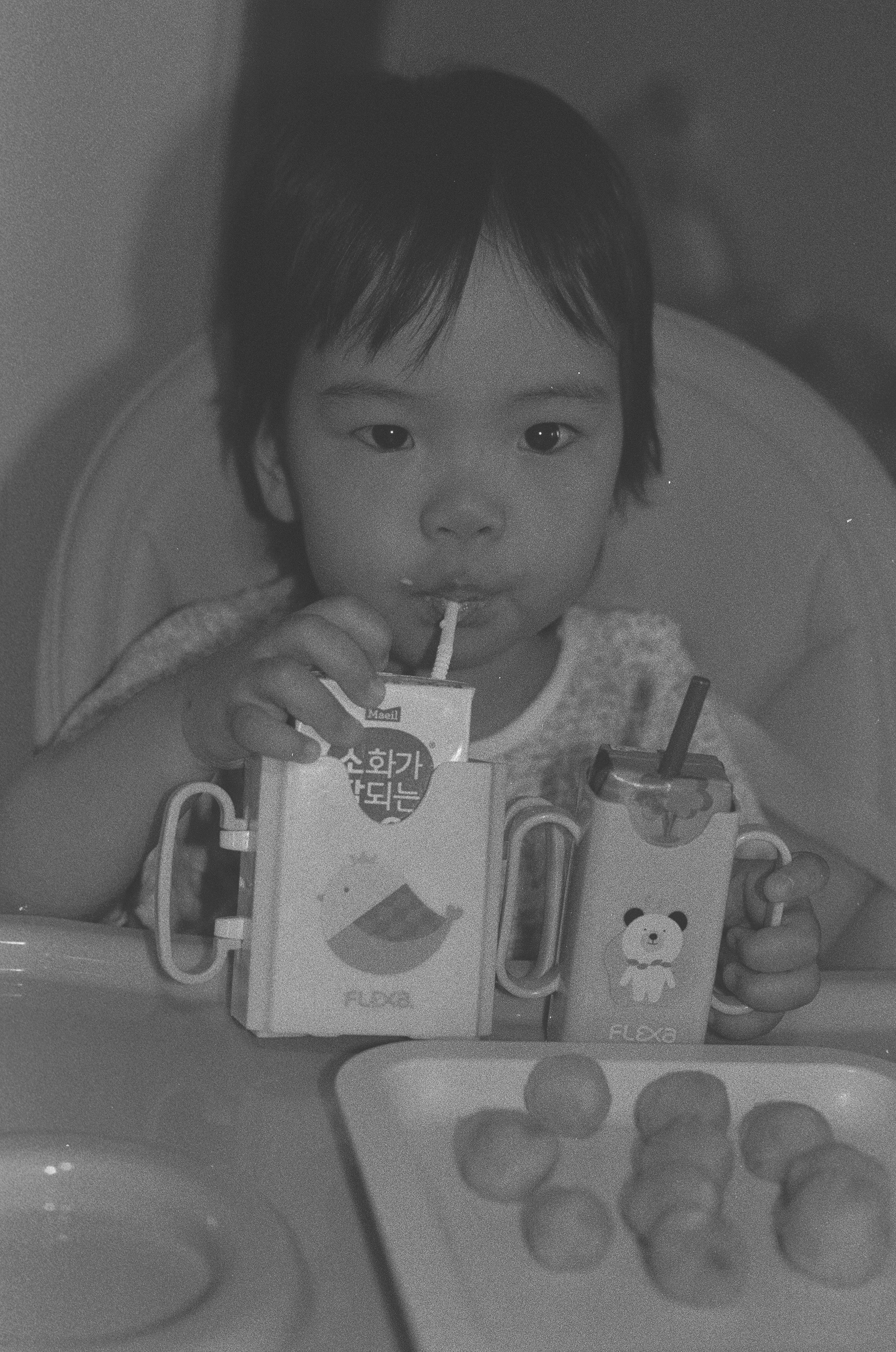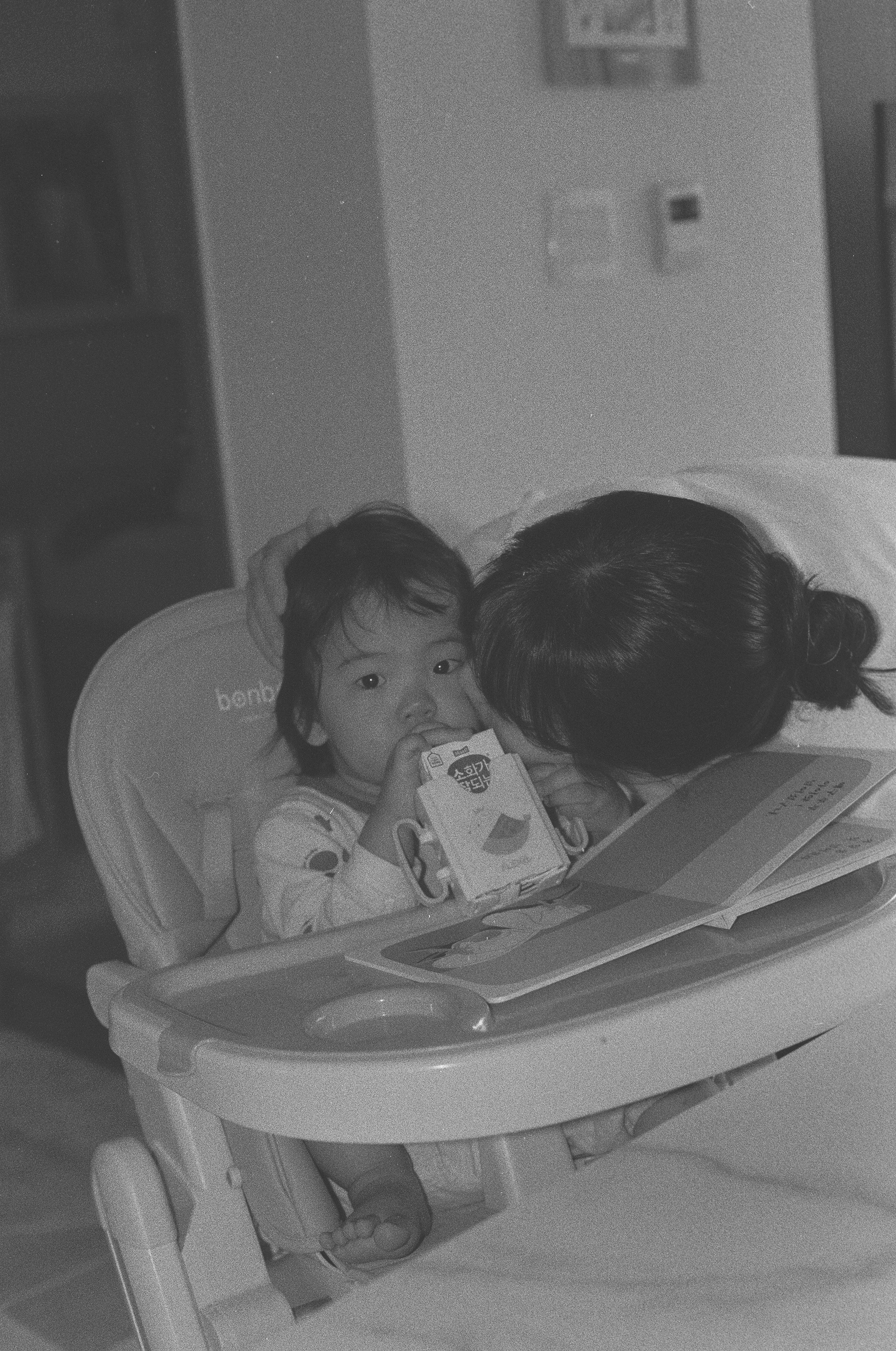 부비적 거리며 일어나는 딸을 안고 나와 의자에 앉혀 우유와 함께 빵을 먹이고