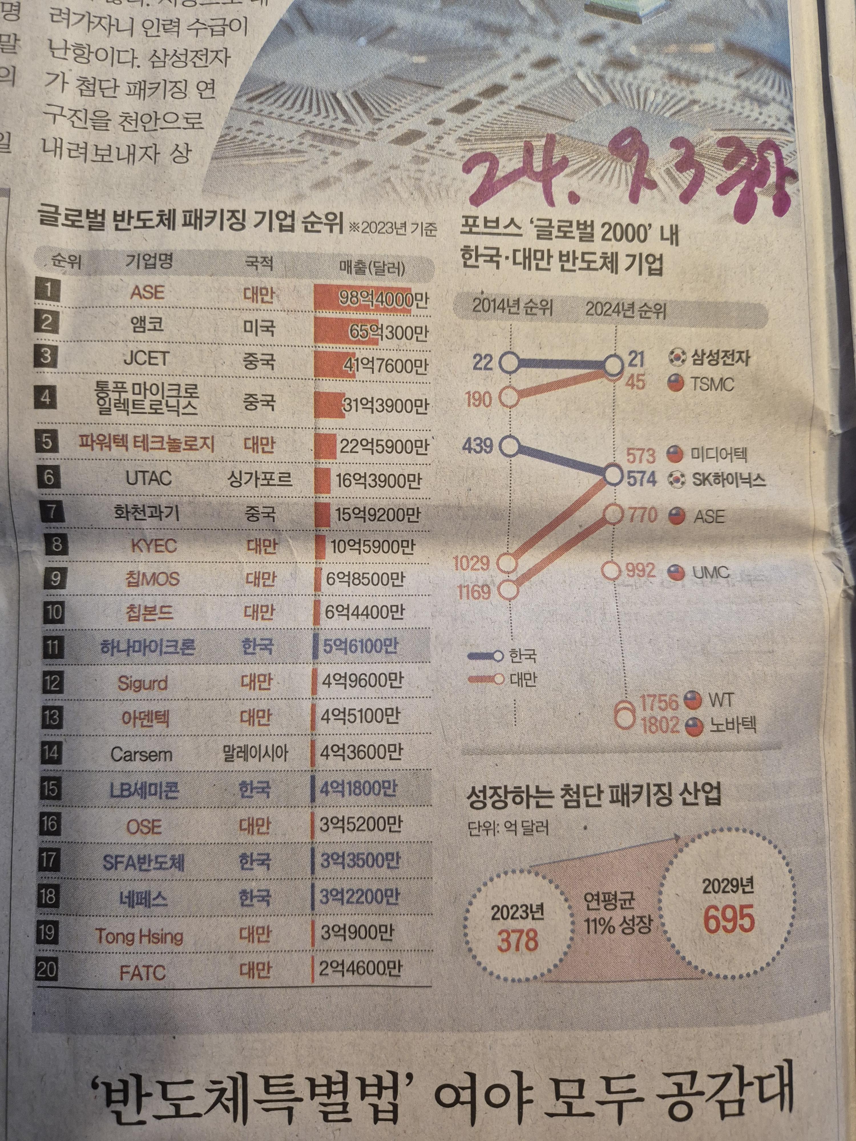 반도체 시장은 정말 변화가 크구나.. 이제는 반도체 패키징, 대만의 성장세 24.9.3 중앙