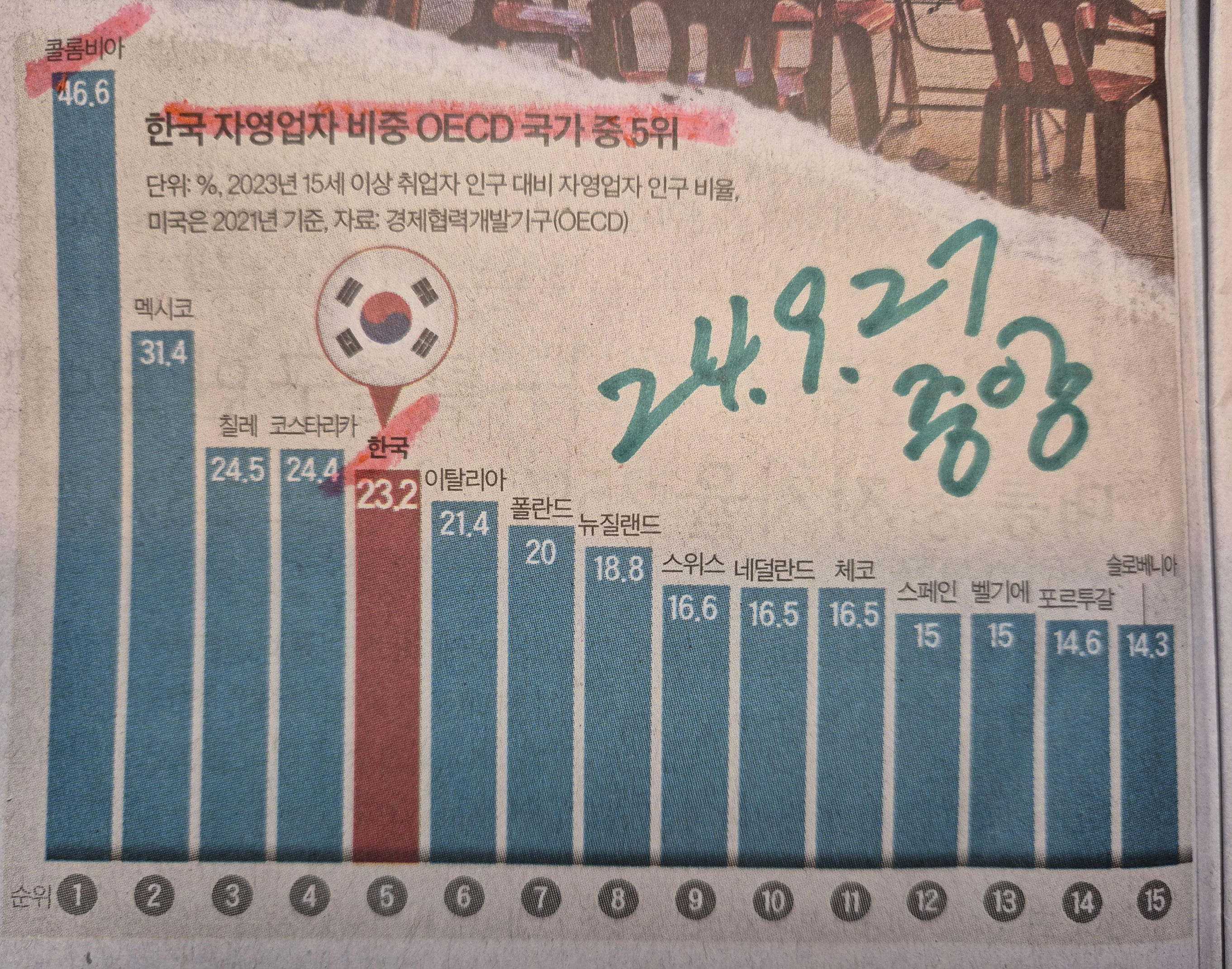 한국 자영업자 OECD 국가 중 상위 몇위? 자영업의 무덤이자 천국 24.9.27 중앙