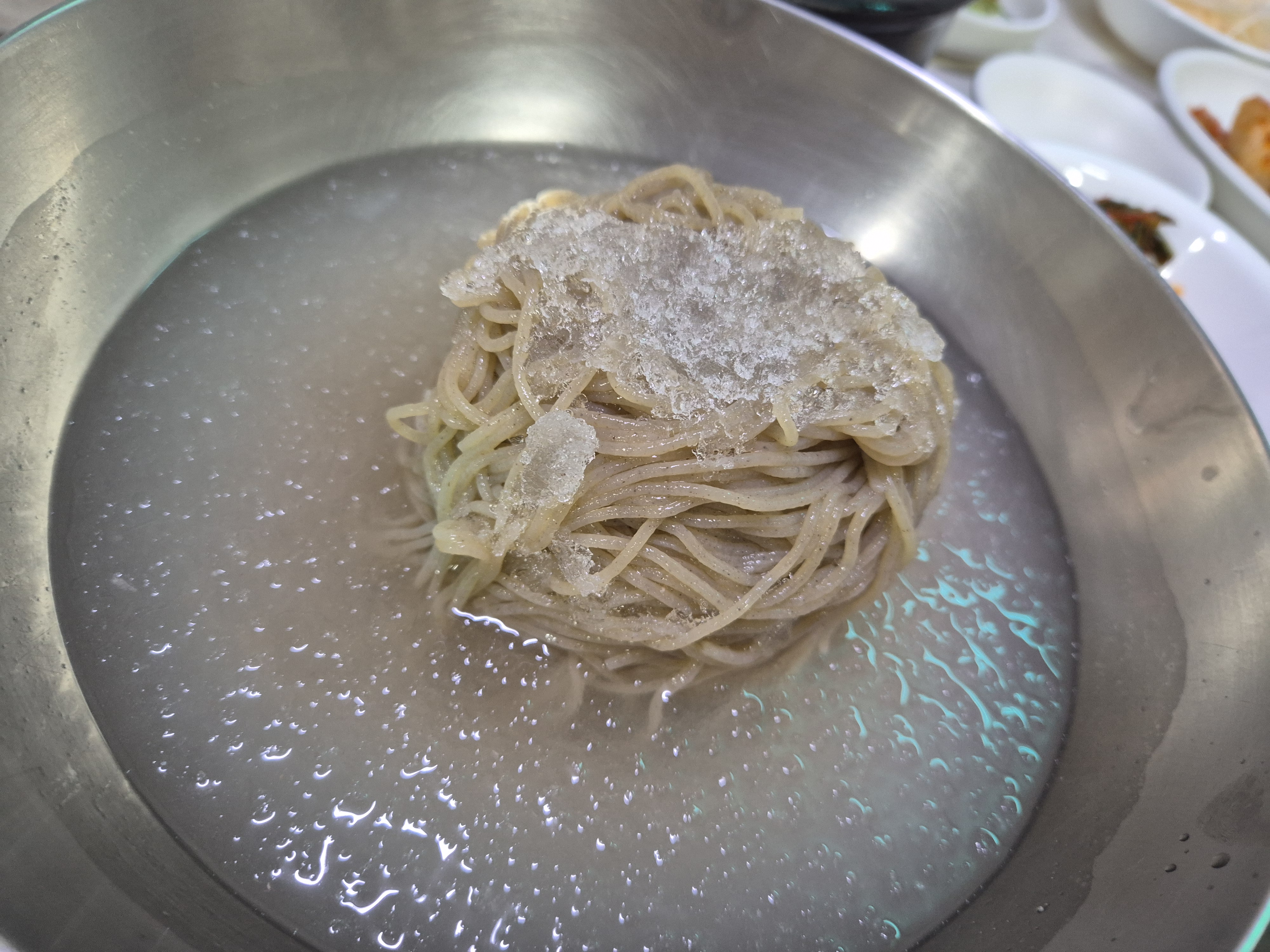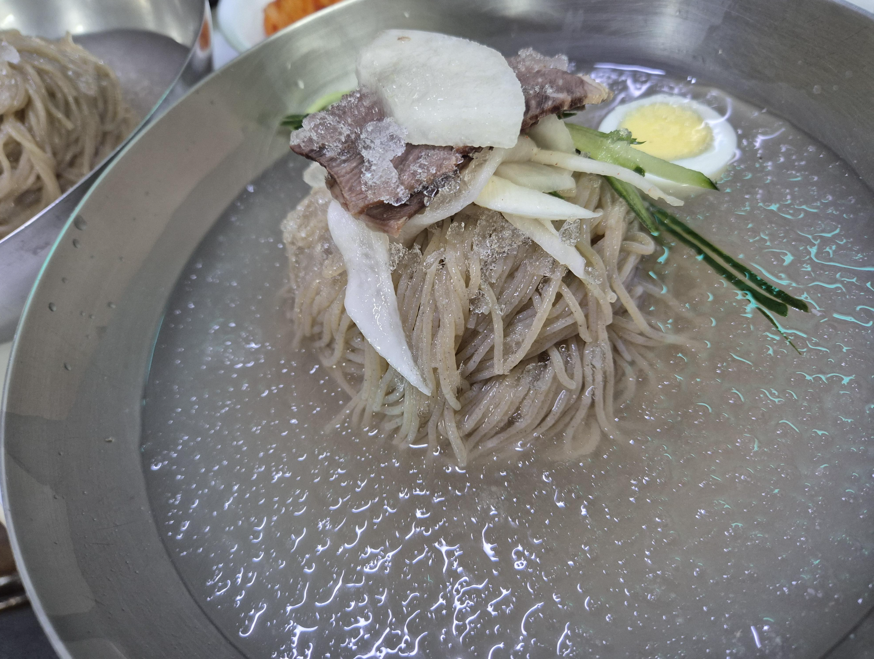 여전히 얼얼히 시원한 평양냉면에 심심한 국물 맛, 처음 나와서 주는 육수로 다시 입안을 덥히거나