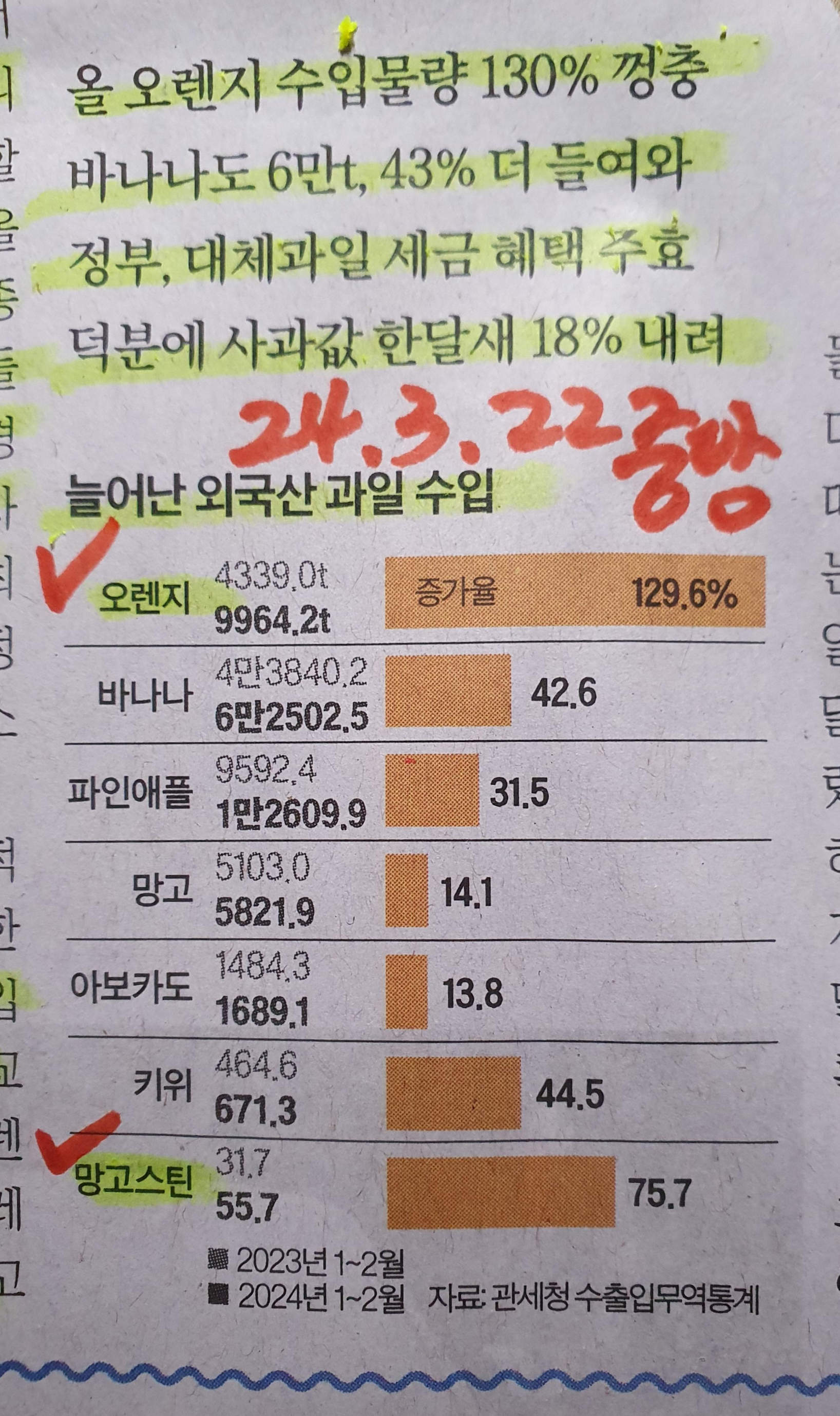-국내 과일 가격의 상승으로 인한 압박으로 반대급부의 수입과일 수입은 큰 폭으로 증가한 것으로 확인된다. -대체 과일 시장의 성장세, 정부는 올해 과일류 할당관계 적용 품목을 6종에서 8종으로 늘렸고, 특히 소비자들에게 인기가 많은 오렌지와 바나나의 경우 직수입하여 대형마트에 20% 할인하여 공급하기로 하였다. -수입과일의 증가폭이 크게 늘어난 것은 오렌지, 바나나, 파인애플, 망고스틴으로 확인된다 -최근 마트에서 과일 구입하는 것이 겁이난다. 아니 모든 물품의 가격이 코로나 이후를 기점으로 적어도 20% 이상씩은 오른 상황. 하지만 월급은 물가에 맞추어 올라간 것이 아니기에 살림살이는 갈수록 퍽퍽해지고 있다. 이 모든 상황이 한국 뿐만 아니라 세계 공통의 현상이는 것이 더욱 무서운 상황. https:/..
