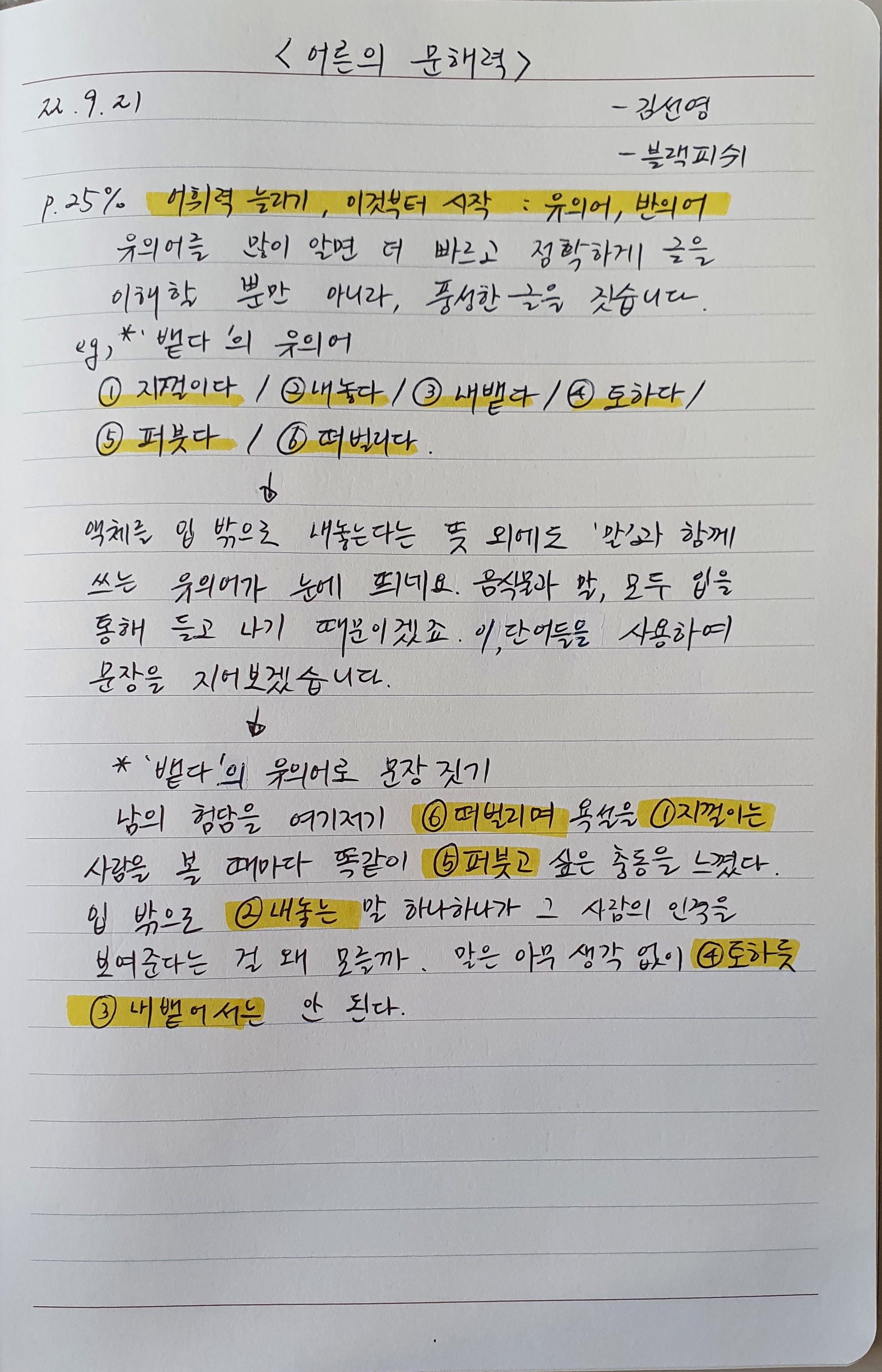 HakoJico Comment)) 글을 잘 쓰기 위한 잘 읽기 위한 지침서. 다른 책과의 차별점은 PT 같은 형식의 단계에 따른 학습 방법을 알려주고 연습문체처럼 습득할 수 있는 방식으로 책의 컨텐츠가 구성되어 있다. 몇 년전 이외수 작가의 글쓰기 관련 책자를 읽으면서 유의어, 반의어를 많이 저장하고 습득하는 것이 좋은 것은 알고 있었지만 학습 적용법에 대한 벽에 부딪쳐서 그만 두었다. 어른의 문해력 책을 읽다가 같은 의미의 유의어를 사용하며 문장을 만들고 실력을 기르는 법을 찾아 노트에 기록해두었다. 목차와 같이 책의 가이드라인을 따라가면 자신의 글쓰기 능력과 독해력을 기르는데 큰 도움이 될 것으로 생각되었다. https://link.coupang.com/a/CB3Uy 어른의 문해력:나도 쓱 읽고 싹 ..