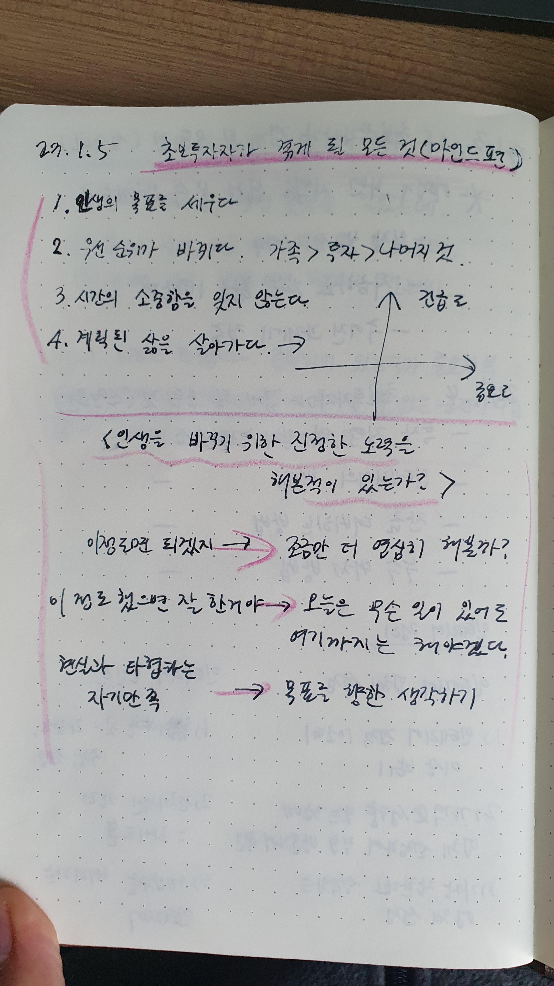 1. 인생의 목표를 세우다 2. 우선 순위가 바뀌다 , 1. 가족, 2. 투자. 3. 나머지 것들 3. 시간의 소중함을 잊지 않는다 4. 계획된 삶을 살아간다. Comment)) 이렇게 공부하고 블로그 생활을 이어나가면서 특히 시간의 소중함을 더욱 깨닫는다. 퇴근 후 6시 이후 부터는 휴식과 소비적인 활동에 집중하였지만 이렇게 계속 생산적으로 생각하고 활동을 하며 나의 시간을 쪼개며 할 수 밖에 없다는 생각으로 지금 순간에 더욱 집중하게 되는 것 같다. 지금은 완벽하지 않더라도 인풋을 지속으로 계속 하는 시기..