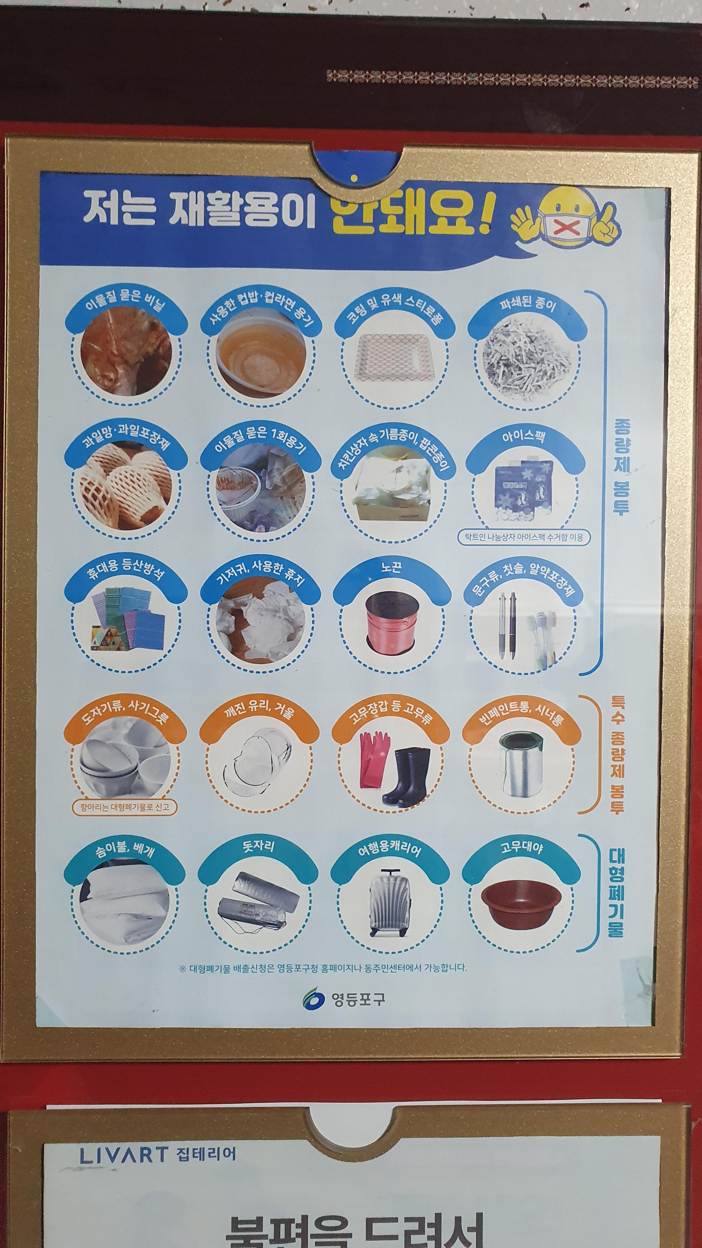 독립해서 살다보면 느끼는 점, 정말 내가 많은 쓰레기를 버리는구나.. 쓰레기가 생기고 재활용 분류를 하려 매번 작업을 할 때마다 인간 한명이 이렇게 많은 오염 물질이 나오는데 영등포에서만 나오는 이렇게 많은 쓰레기를 처리하는 것도 큰일이라는 생각이 든다. 그리고... 무엇보다 어려운 건 알듯 말듯한 재활용 용품이 안되는 용품들을 구분하는 것이다. 종량제 봉투에 버리는 물품들 이물질 묻은 비닐 / 사용한 컵밥. 컵라면 용기 / 코팅 및 유색 스티로품 / 파쇄된 종이 / 과일망. 과일포장재 / 이물질 묻은 1회용기 / 치킨상자 속 기름종이, 팝콘종이 / 아이스팩 / 휴대용 등산방석 / 기저귀, 사용한 휴지 / 노끈 / 문구류. 칫솔. 알약 포장재 특수 종량제 봉투 도자기류. 사기그릇 / 깨진 유리. 거울 /..
