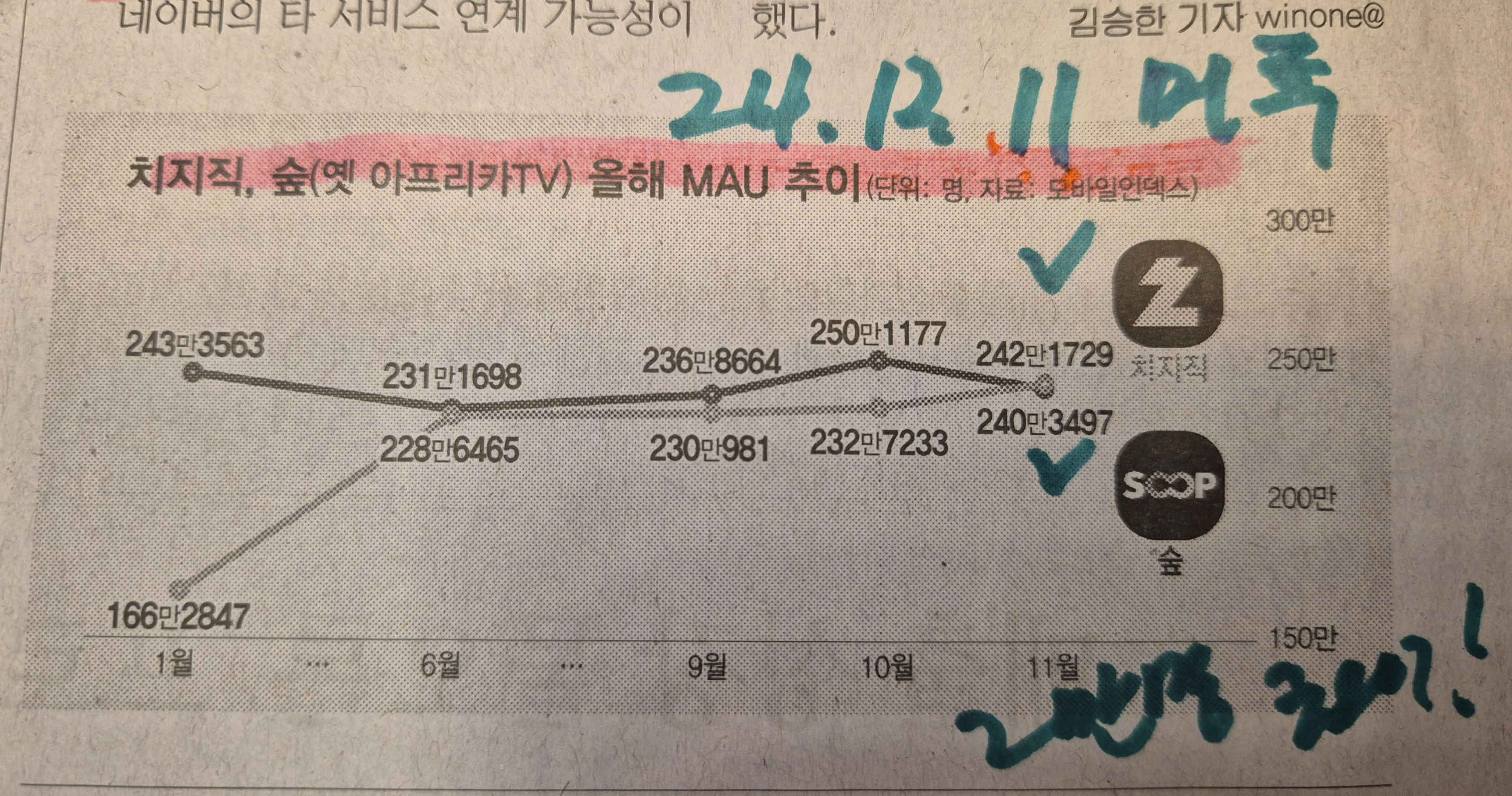 -아프리카티브이의 패악이 커지며 이제는 숲이라는 새로운 플랫폼으로 운영 중. 네이버의 경우 트위치의 빈자리에 침투하여 1월 166만 이후 11월 242만이라는 엄청난 성장세로 스트리밍 티브이 시장 선두에 나서고 있다. -월 이용자 치지직 242만, 숲 240만을 기록하며 치지직의 선두권을 유지 중-치지직의 성장세는 네이버라는 대한민국의 가장 큰 플랫폼에서 활동하는 것뿐만 아니라. 2024년 LOL의 단독 중계권을 유치하며 유저들의 유입을 적극적으로 유도한 면이 크다. -결국 게임을 중심으로는 치지직, BJ 등 개인을 중심으로는 여전히 숲이 강세를 보여주고 있는 상태이다. -과연 스트리밍 시장은 어떻게 될지 2025년이 궁금해진다. 2024.03.06 - [MONEY & TREND LOG] - 스트리밍 치..