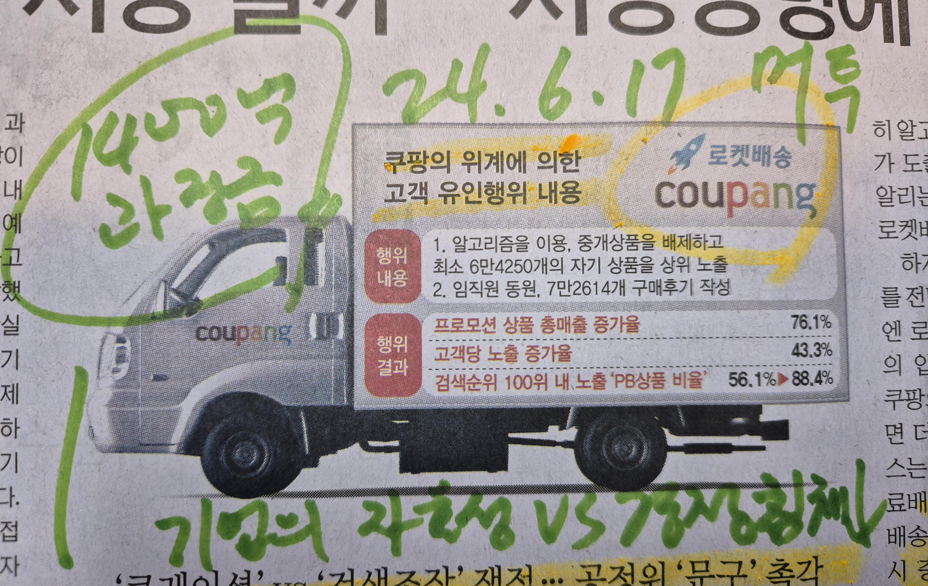 -쿠팡에서 물건을 구입하는 이유? 빠르고 싸서 pb상품의 선택지가 큰 영향을 미친다고 생각한다.-쿠팡의 말도 일리는 있다 생각된다. 투자할만큼 22조원이 넘는 돈을쓰고 물류센터와 제품을 빠르게 수급하는데 다른 회사 물품에 눈에 안띈다고 과징금이라는것이-하지만 사회적 영향성을 보았을때 소비자의 선택권 또한 영향을 미치는 것이 좋을 수는 없는 것이다.-여기에 쿠팡의 배째라식의 협박.. 철수한다는 미국 기업을 누가 욕하겠냐만 사람들과 국가를 상태로 크게 배팅하는 모습으로 보일 수 밖에 없다.https://www.mt.co.kr/